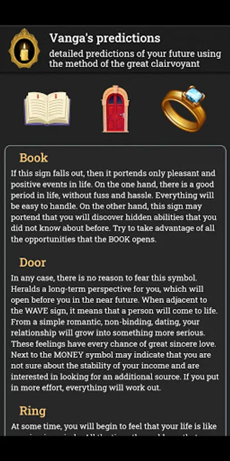 Fortune-telling Vanga is a detailed forecast for the future according to the method of the great clairvoyant. For divination, a magic mirror and lighted candles are used. You need to touch the mirror and wait for the symbols to appear in the reflection. The result of fortune-telling is interpreted depending on the symbols that appear and their combinations.