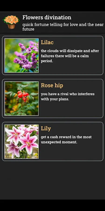 Fortune-telling by colors is a beautiful and quick fortune-telling for love and the near future. You need to open three cards with images of flowering plants. Each flower has its own interpretation when divining on a relationship with a loved one.