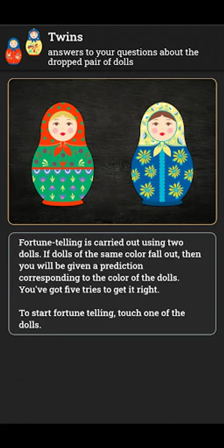 Divination Twins - answers to your questions with the help of a pair of dolls of different colors. You will have several tries to match the colors of the dolls. Depending on their color, you will be given a forecast for the situation you are interested in or for solving a problem.