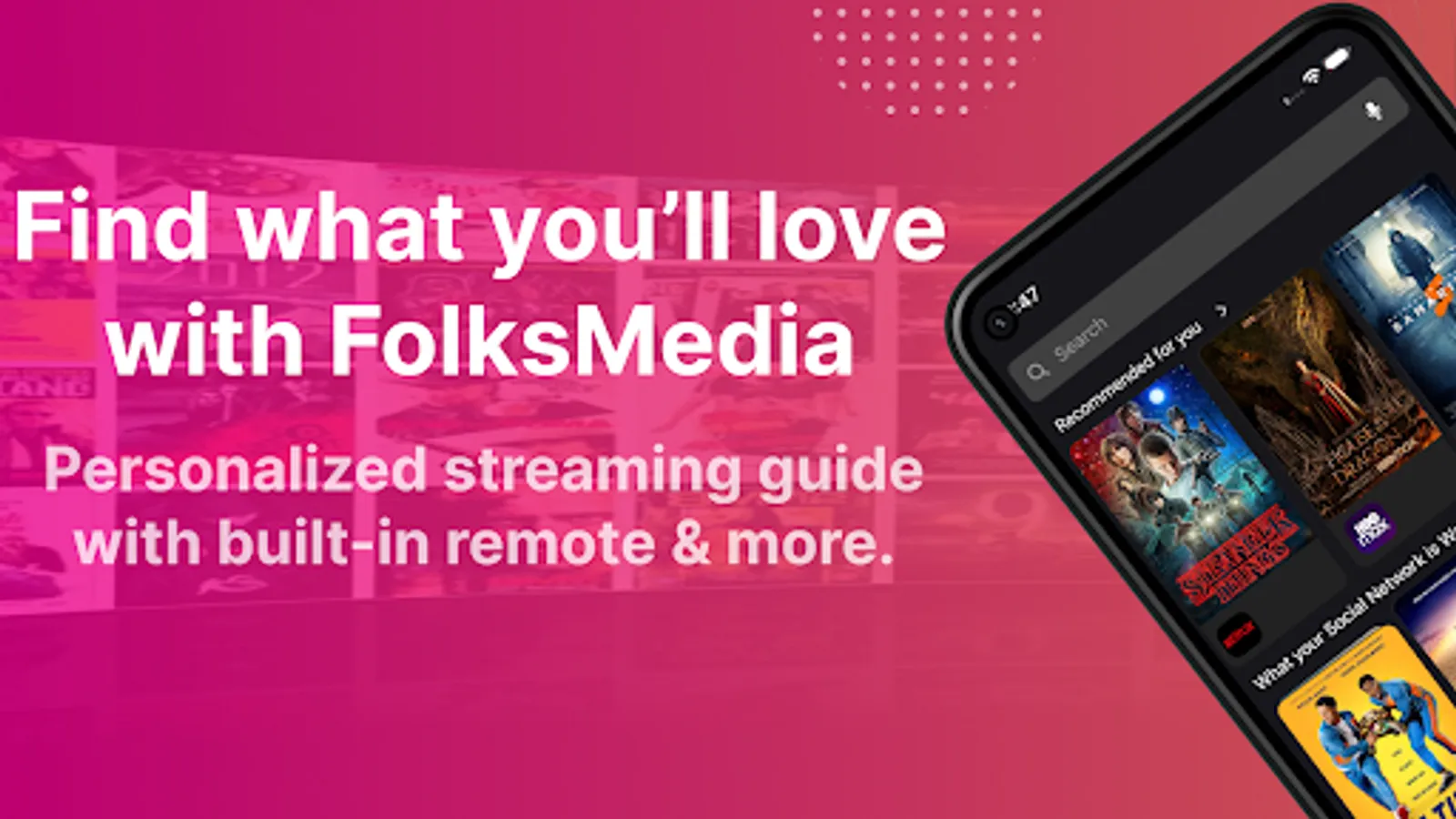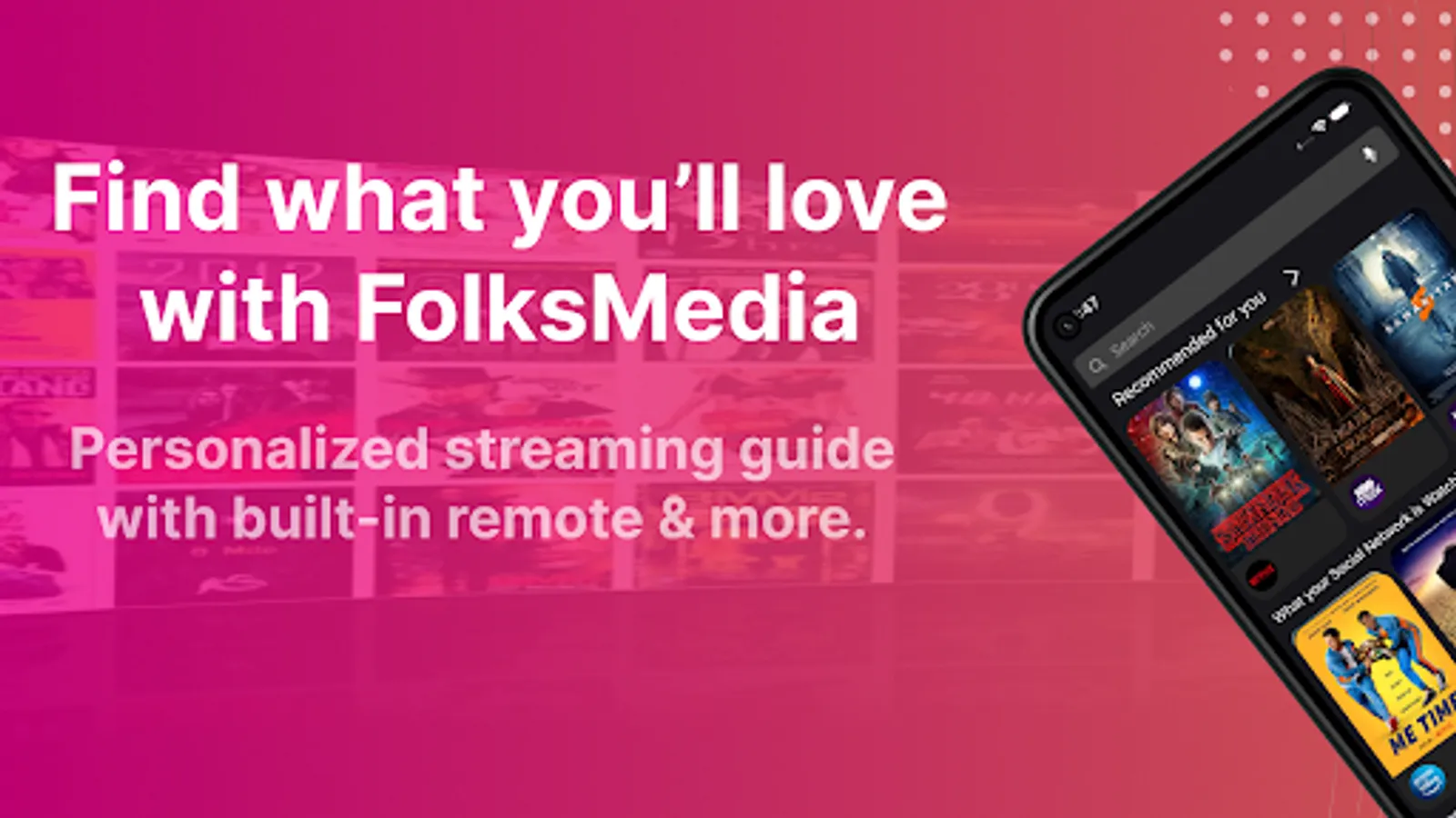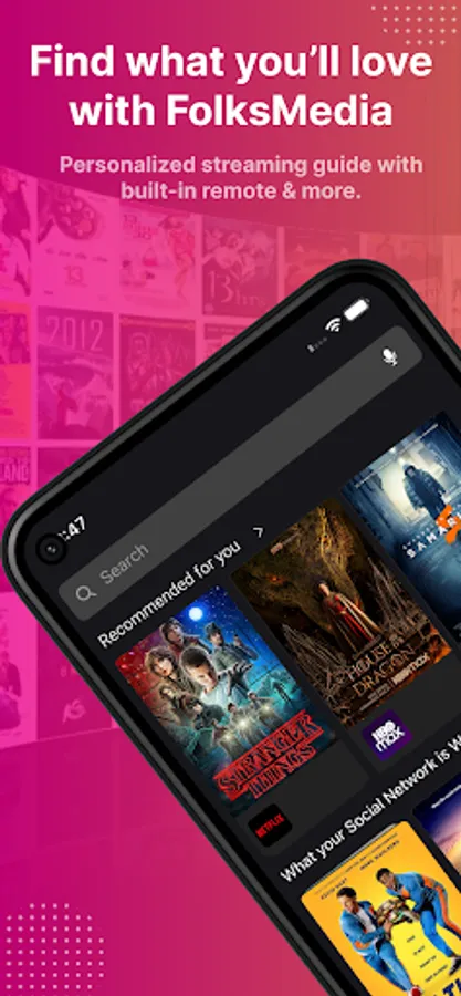 We connect you to your content directly on your smart phone or use the built-in remote control for your TV/streaming device. Discover movies & TV shows on Netflix, Amazon Prime Video, Disney+, HBOMax, Hulu, Showtime, Starz, Paramount+, and more. Find free movies & TV shows from Tubi, Pluto, Vudu, and others. Use our remote control feature now with Roku TV, Fire TV, Android Smart TVs, and Samsung Smart TVs. Plus you’ll earn rewards for being part of the FolksMedia Community.