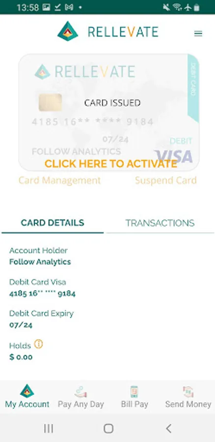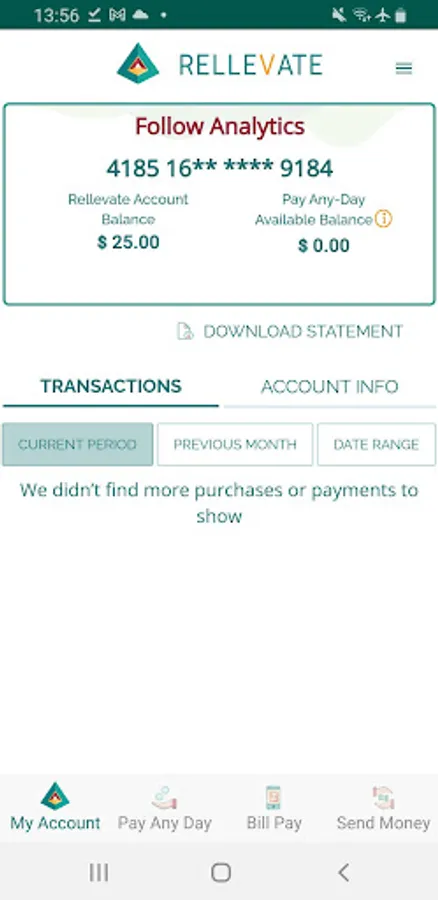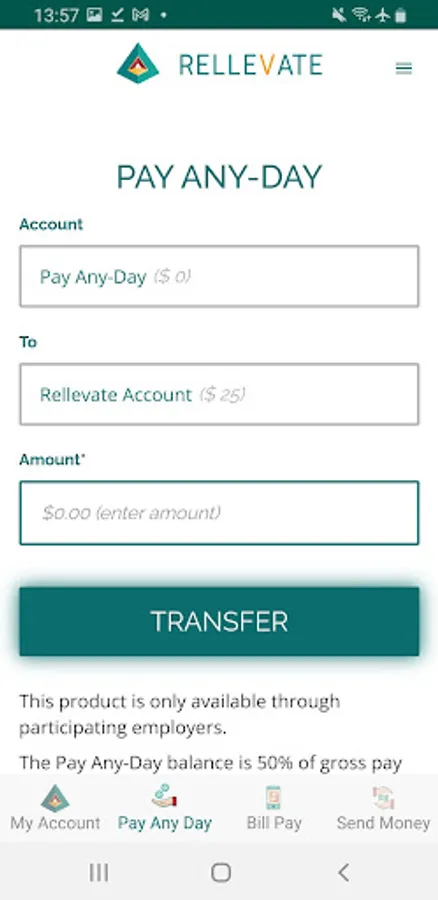 For employees whose employer is offering Rellevate, you can access up to 50% of your pay before payday via Pay Any-Day. The funds are transferred real-time to your Rellevate Account.