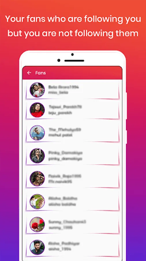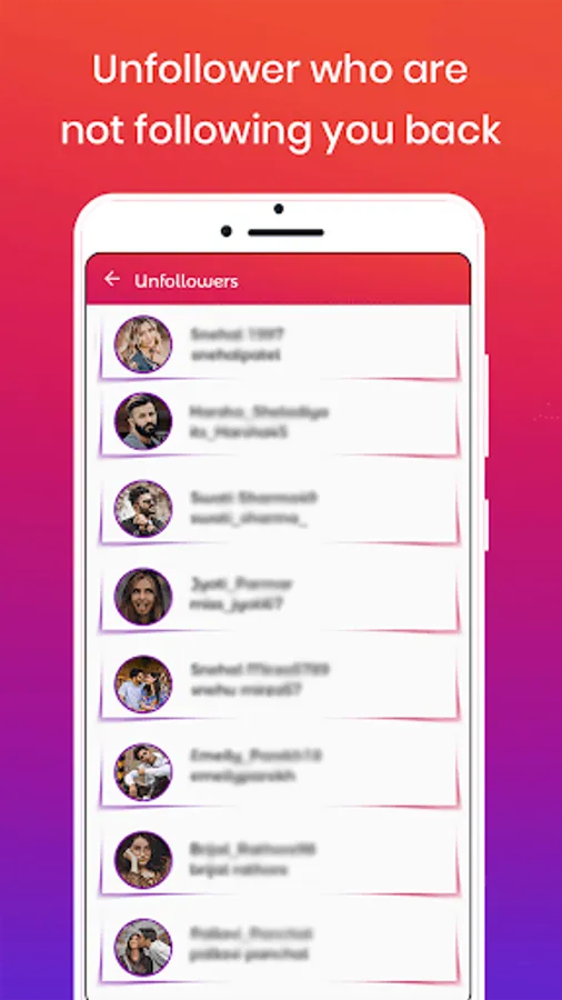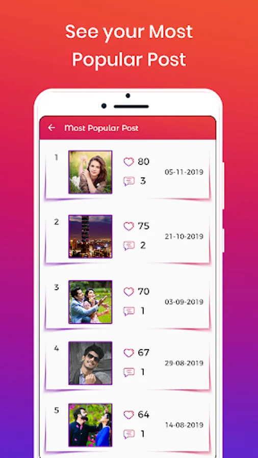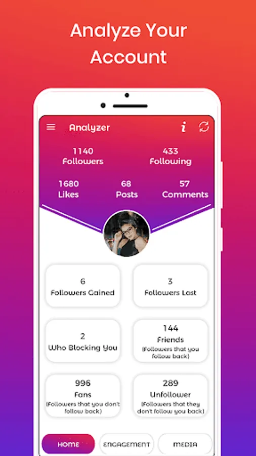 This App Makes detailed and accurate analysis of yoursociali profile. Now You can easily know how many real followers you have and also you can remove people who don't follow back. With our post analysis tool you can track your most popular and least popular posts. View all your media categorized based on likes and comments received.