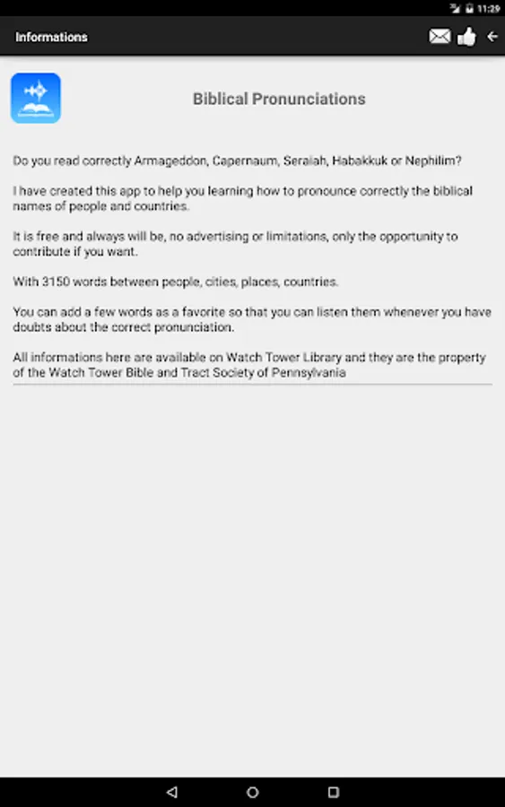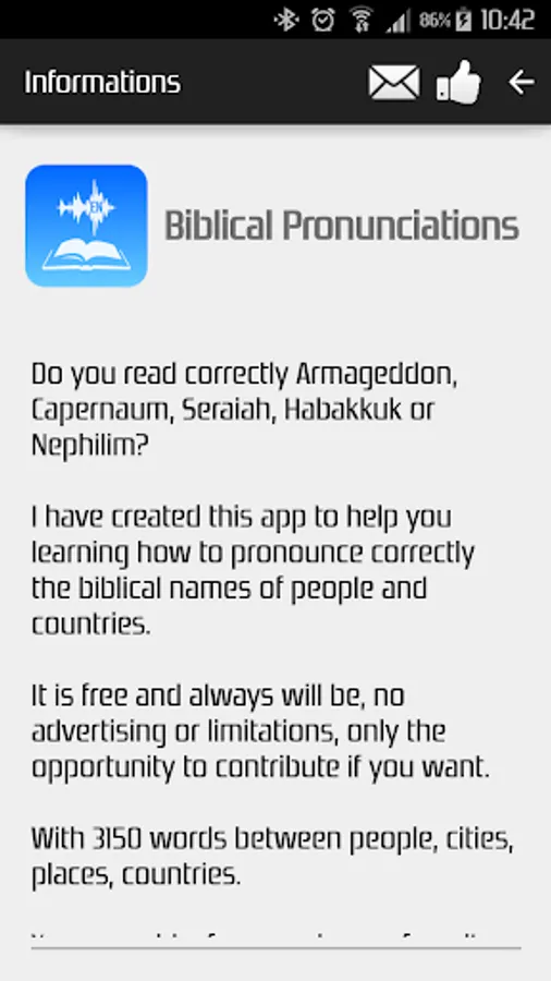 I have created this app to help you learning how to pronounce correctly the biblical names of people and countries.