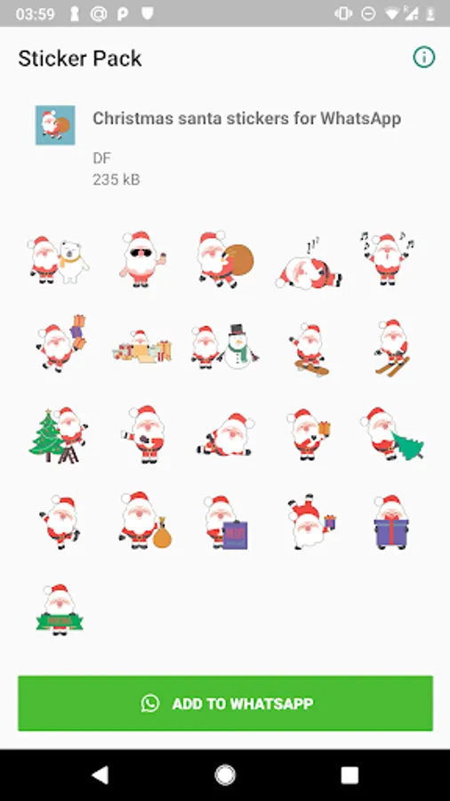 To make you have fun with our Santa Claus stickers for WhatsApp application We provides with 4 packs of amazing Santa Claus sticker and Father Christmas emoji including: happy Santa Claus, angry papa noel dabbing Santa Claus, super Father Christmas, crying Santa Claus stickers all of them are shareable for any chat messengers in your phone. Select your preferred Santa Claus sticker for WhatsApp and add it easily in to your conversation just a few a clicks you can share all Santa Claus you want with your friends and spend funny times with our application all the christmas eve.