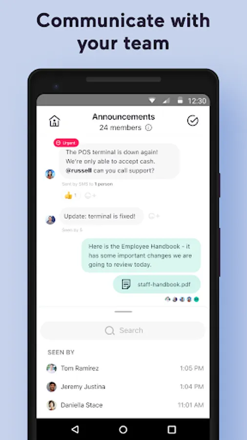 * Communicate with your team in groups or 1:1s without sharing phone numbers