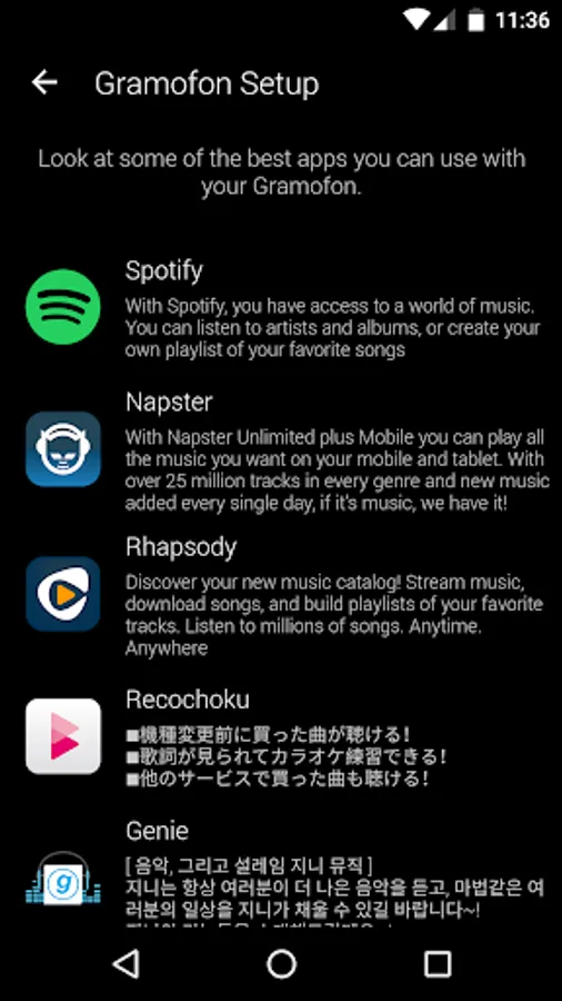 The Gramofon streams cloud music to your sound system. Use your handset or tablet as a remote controller and play music on the Gramofon directly from Spotify, Rhapsody, Napster, Wahwah, TuneIn etc.