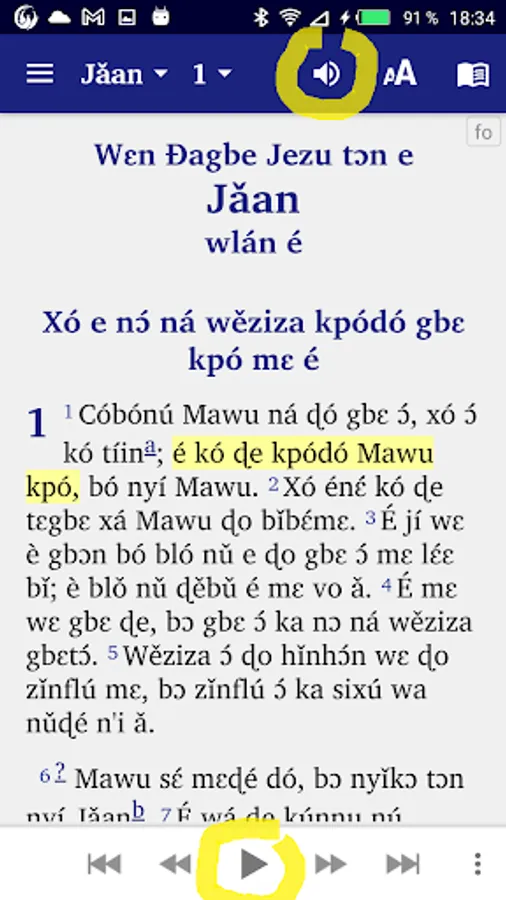 • Give your phone permission to download audio files for Fon, French, or English New Testament texts. Once downloaded, the audio files will remain on your device for reuse in offline mode.