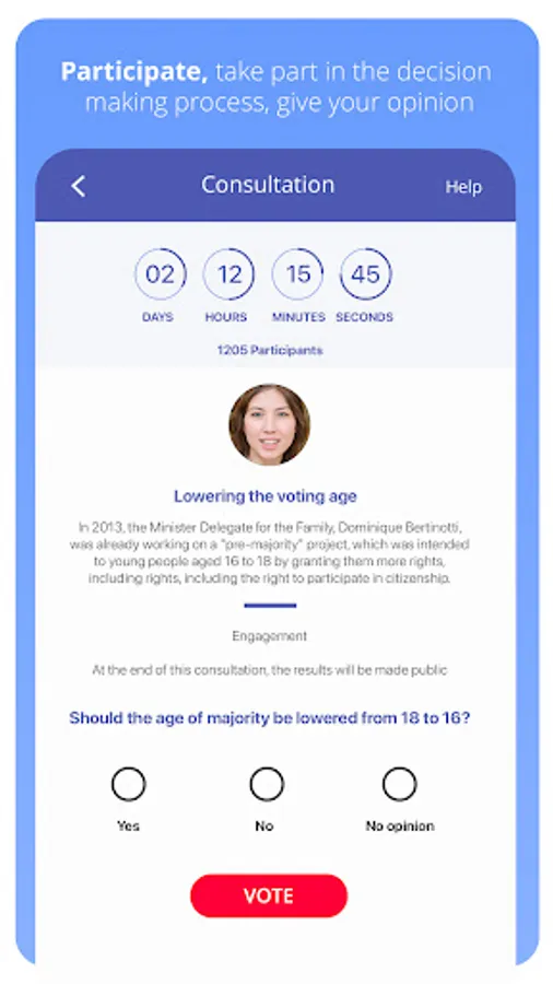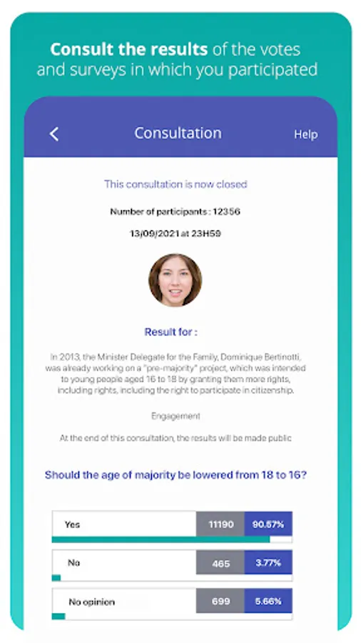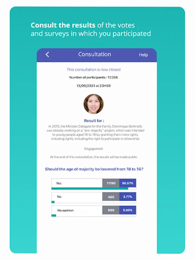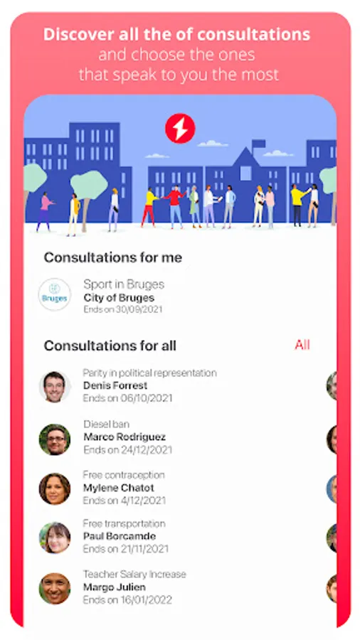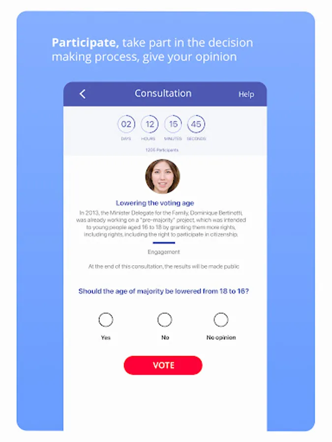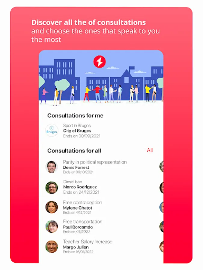 Find out and participate in the consultations to which you are invited, or in one of the many public consultations accessible within the app. Whether it's about the name of a street in your neighborhood, a new sports facility in your city or an arbitration on an organization budget: express yourself on the topics that matter to you.