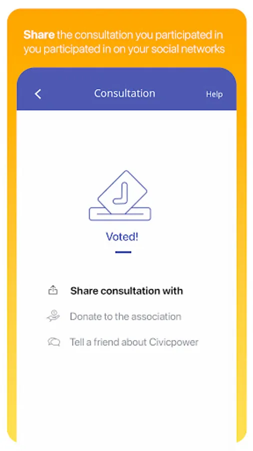 Civicpower allows you to be a part of the decisions that affect you in an intuitive way, using only a few steps. The secrecy of your vote is preserved and, if the organizer authorizes it, you can change your choice during the consultation.