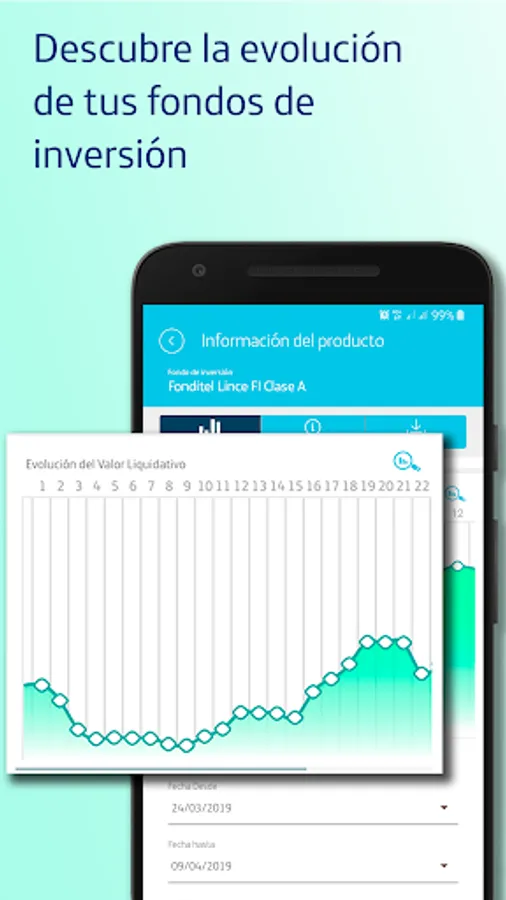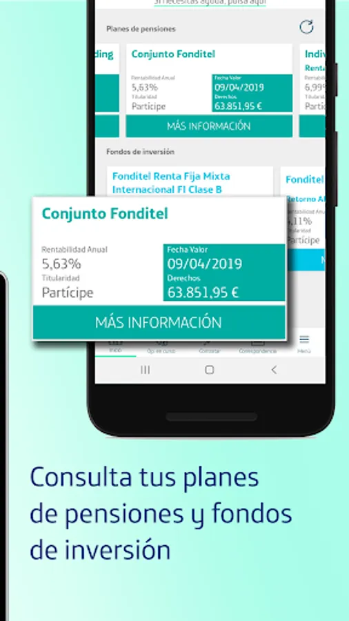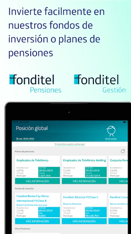 From our application you can operate with us from the palm of your hand. You will have access at all times to your personal information. You can easily invest in our investment funds and in our pension plans. You can check the evolution of your pension plans and the performance of your investment funds. You will also have instant access to historical profitability data. At Fonditel we have been improving the future of our clients for more than 20 years. And we will continue to do so. We add value to the management of our customers' savings by making available our extensive experience, high capacity for innovation and independence in decision-making.