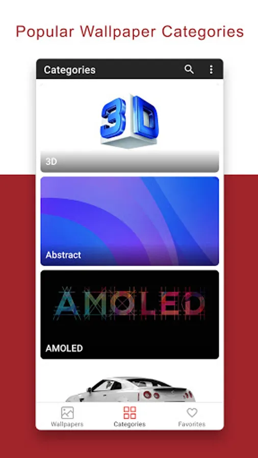 Categories include 3D, AMOLED, Abstract, Nature, Solid Colors, Cars, Flowers, Material, Minimal and many more...