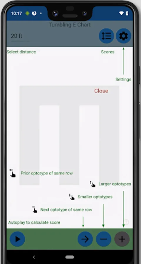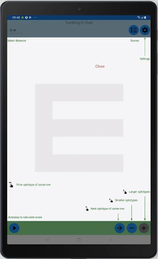 In Autoplay, the app calculates the score. For LogMAR notation, the score is (LogMAR value of the best line read) + 0.02 x (number of optotypes missed). And the maximum missed is 3. For VAS notation, the score is an inversion of the logMAR scale, based on VAS=100-50xlogMAR. For other notations, the score is the notation value of the best line read and optionally minus number of optotypes missed, and the maximum missed is 2.