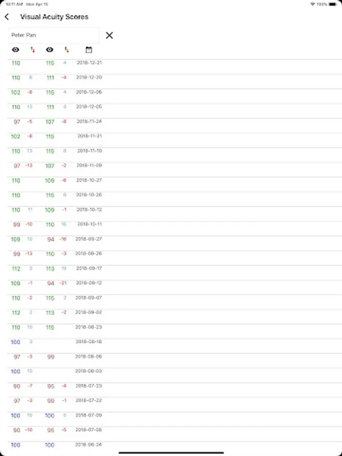 Through enabling “Record Scores” in Settings, you can keep track of the progression of your visual acuity. Visual acuity scores of multiple testees could be recorded. Visual Acuity Score (VAS) is an inversion of the logMAR scale, based on VAS=100-50xlogMAR. It is more intuitive since higher values indicate better visual acuity.