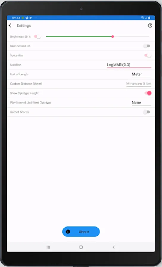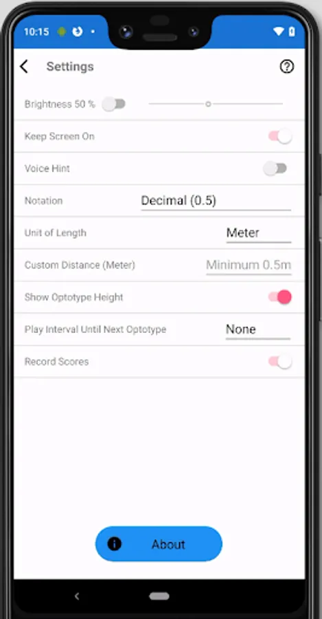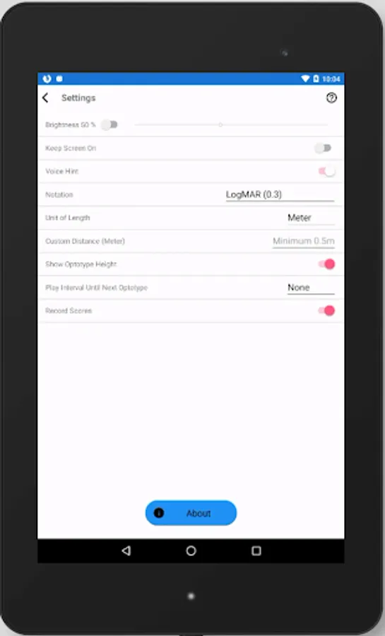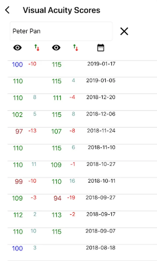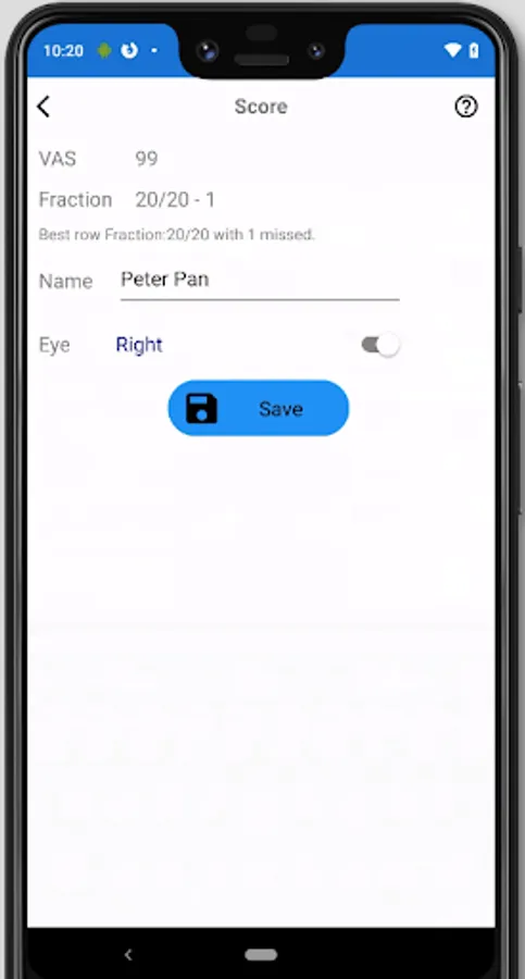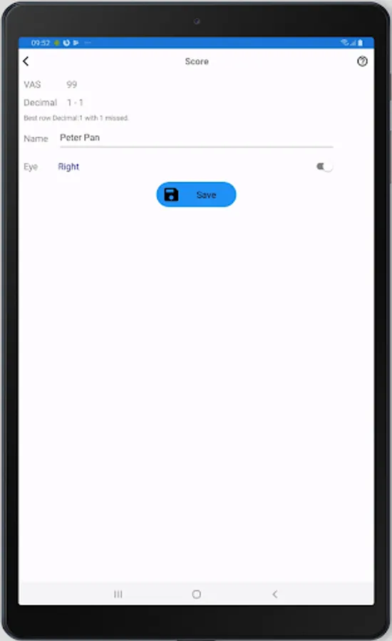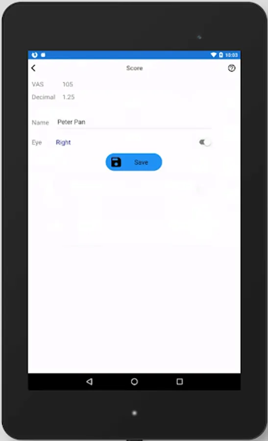 Through enabling “Record Scores” in Settings, you can keep track of the progression of your visual acuity. Visual acuity scores of multiple testees could be recorded. Visual Acuity Score (VAS) is an inversion of the logMAR scale, based on VAS=100-50xlogMAR. It is more intuitive since higher values indicate better visual acuity.