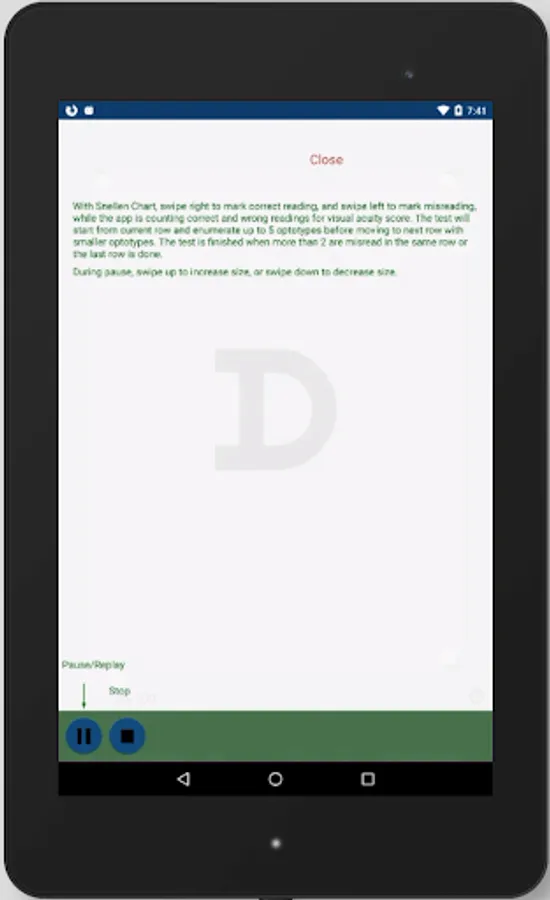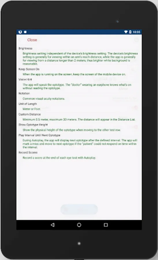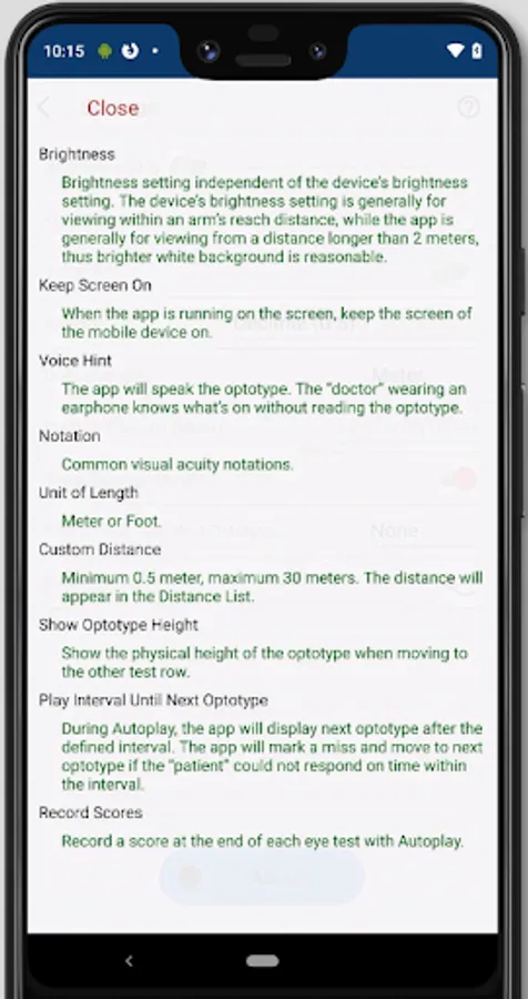 Prevention is better than cure. Designed for children older than 6, parents with young children, and general practitioners, this app displays optically precise optotypes of Snellen Chart for you to measure distant visual acuity accurately in order to detect nearsightedness or myopia and early, so you can take preventive measures and seek help from medical professional early to prevent pseudomyopia from becoming myopia, or prevent nearsightedness from getting worse.