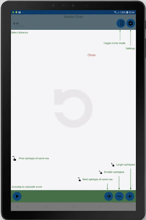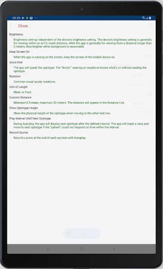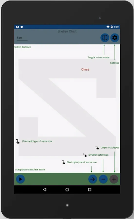 In Autoplay, the app calculates the score. For LogMAR notation, the score is (LogMAR value of the best line read) + 0.02 x (number of optotypes missed). And the maximum missed is 3. For VAS notation, the score is an inversion of the logMAR scale, based on VAS=100-50xlogMAR. For other notations, the score is the notation value of the best line read and optionally minus number of optotypes missed, and the maximum missed is 2.