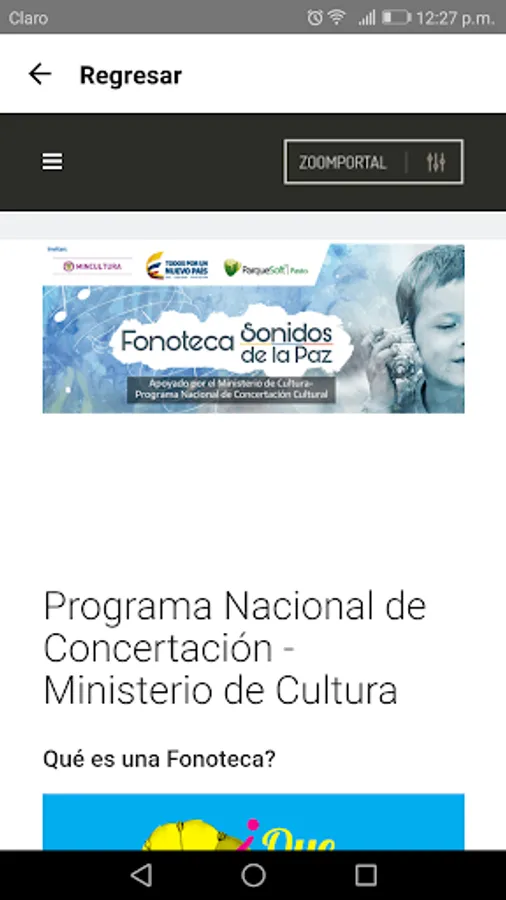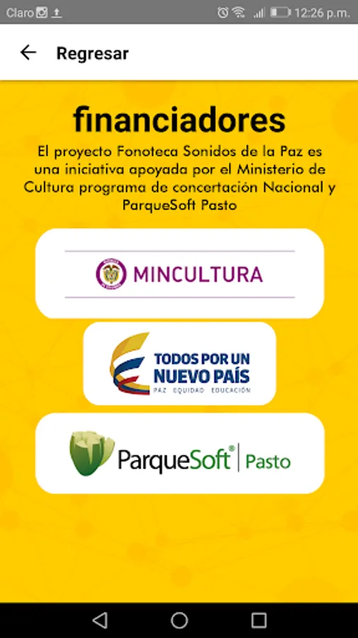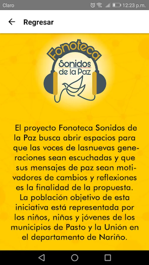 Fonoteca Sounds of Peace comes true thanks to the economic contributions made by the Ministry of Culture at the National Cultural Program Coordination and ParqueSoft Pasto where through a digital home application peace messages, audio content, radio programs; motivators changes, reflections and sound production. The contents to be found are built by children and young people between 13 and 17 years within the framework of the main activities in public libraries in the municipalities of Pasto in Nariño Colombia and Buesaco.