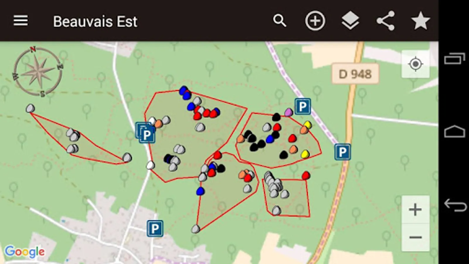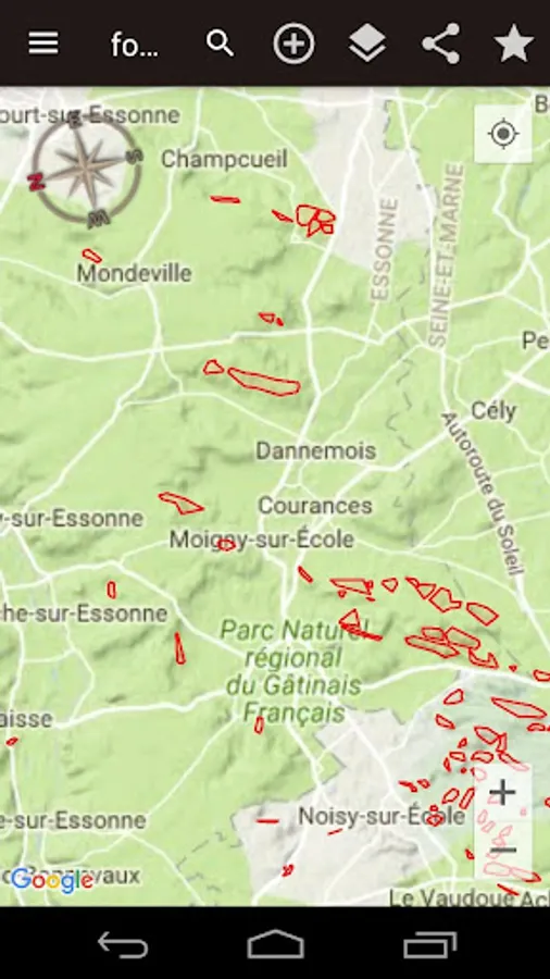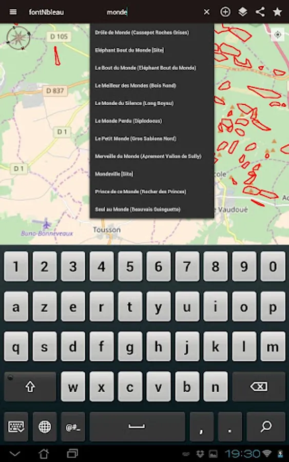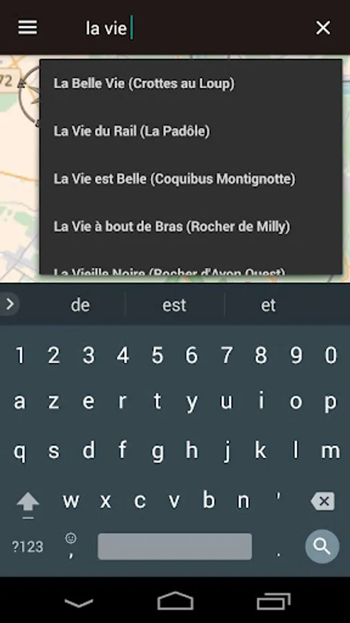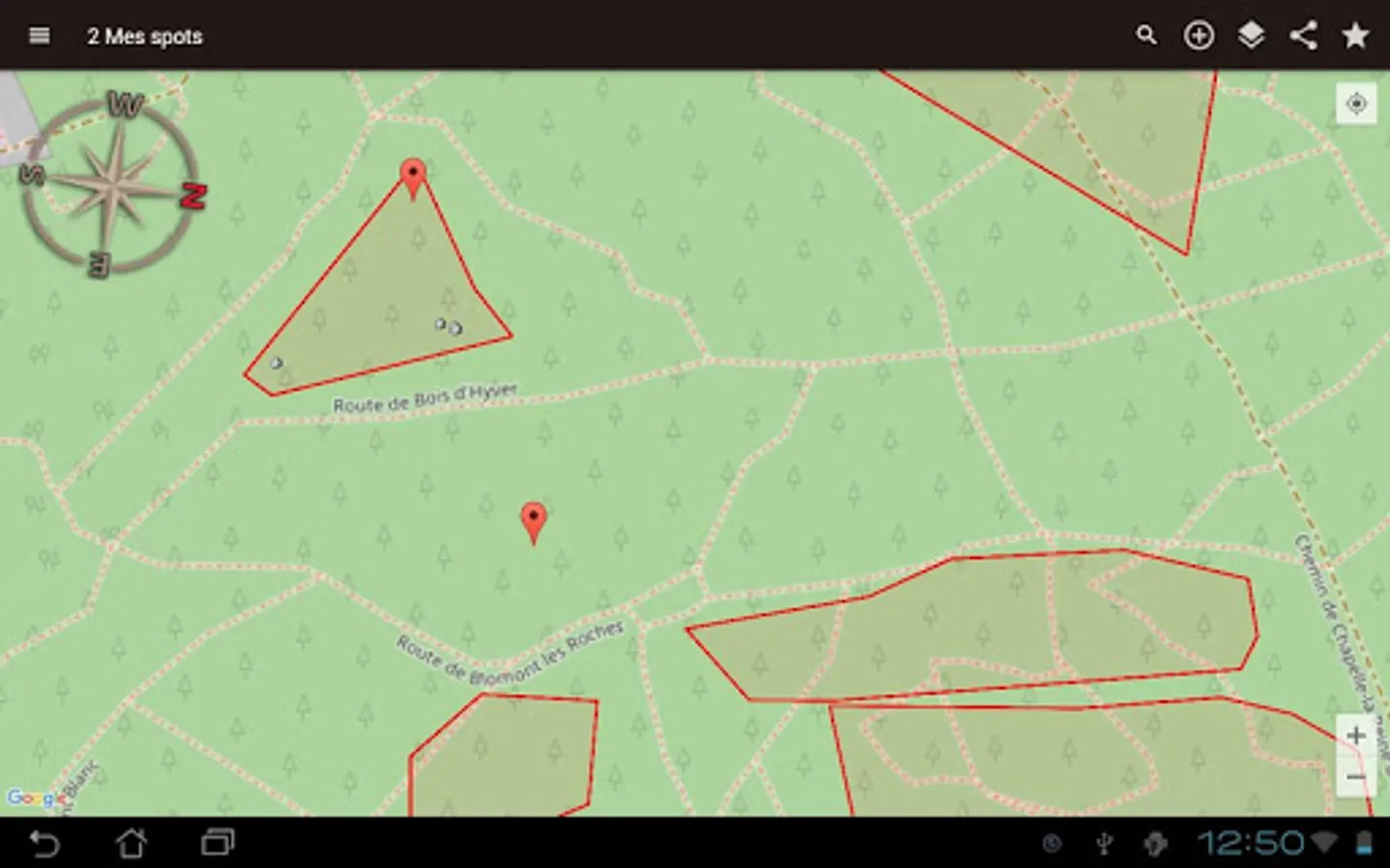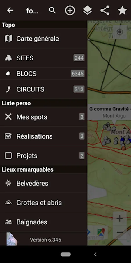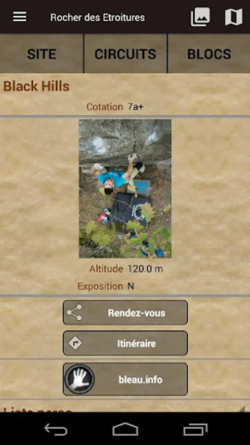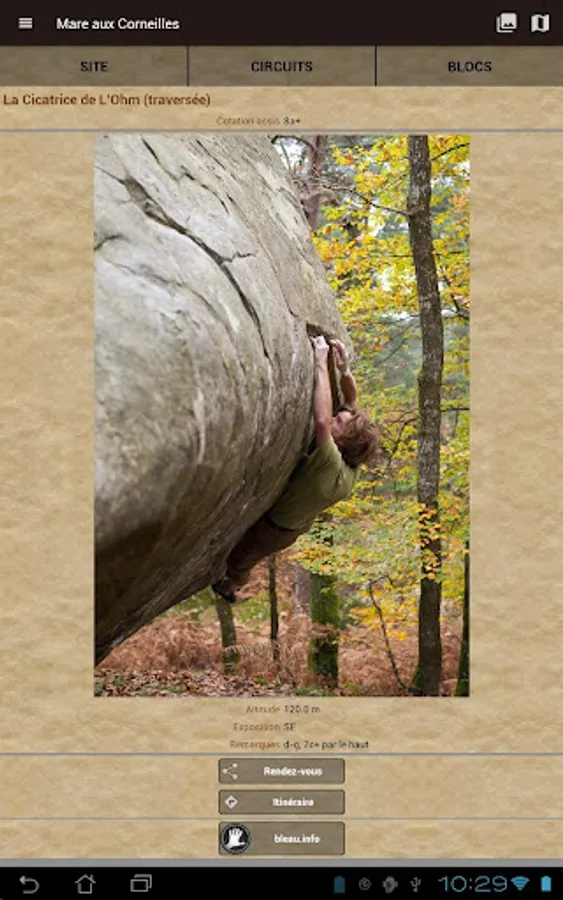 You can also save your own spots from GPS position or long-click on the map and share them with kml files, arrange meeting places with your friends by SMS, email or any of your social network by using Google Map links or the fontNbleau app itself, or compile your own personal list of problems climbed and current projects.
