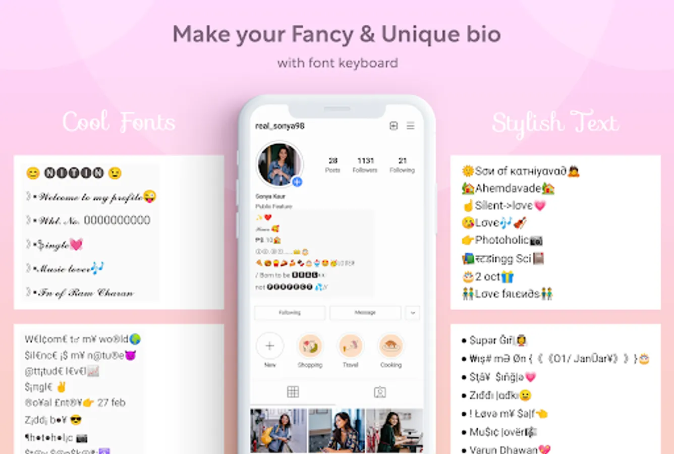 Make your social media profiles stand out with Fonts, or send cool fonts texts to your friends. Turn heads, stand out, and get creative! You can use Fancy Fonts keyboard for your: