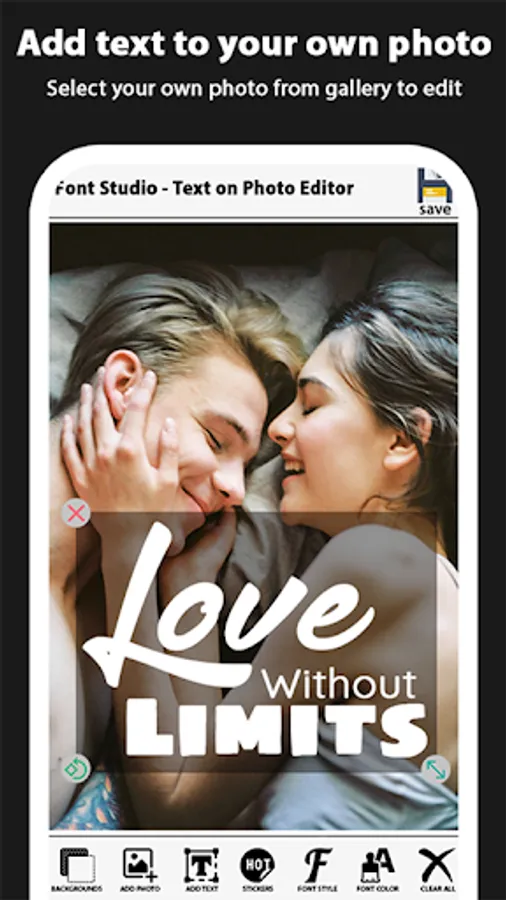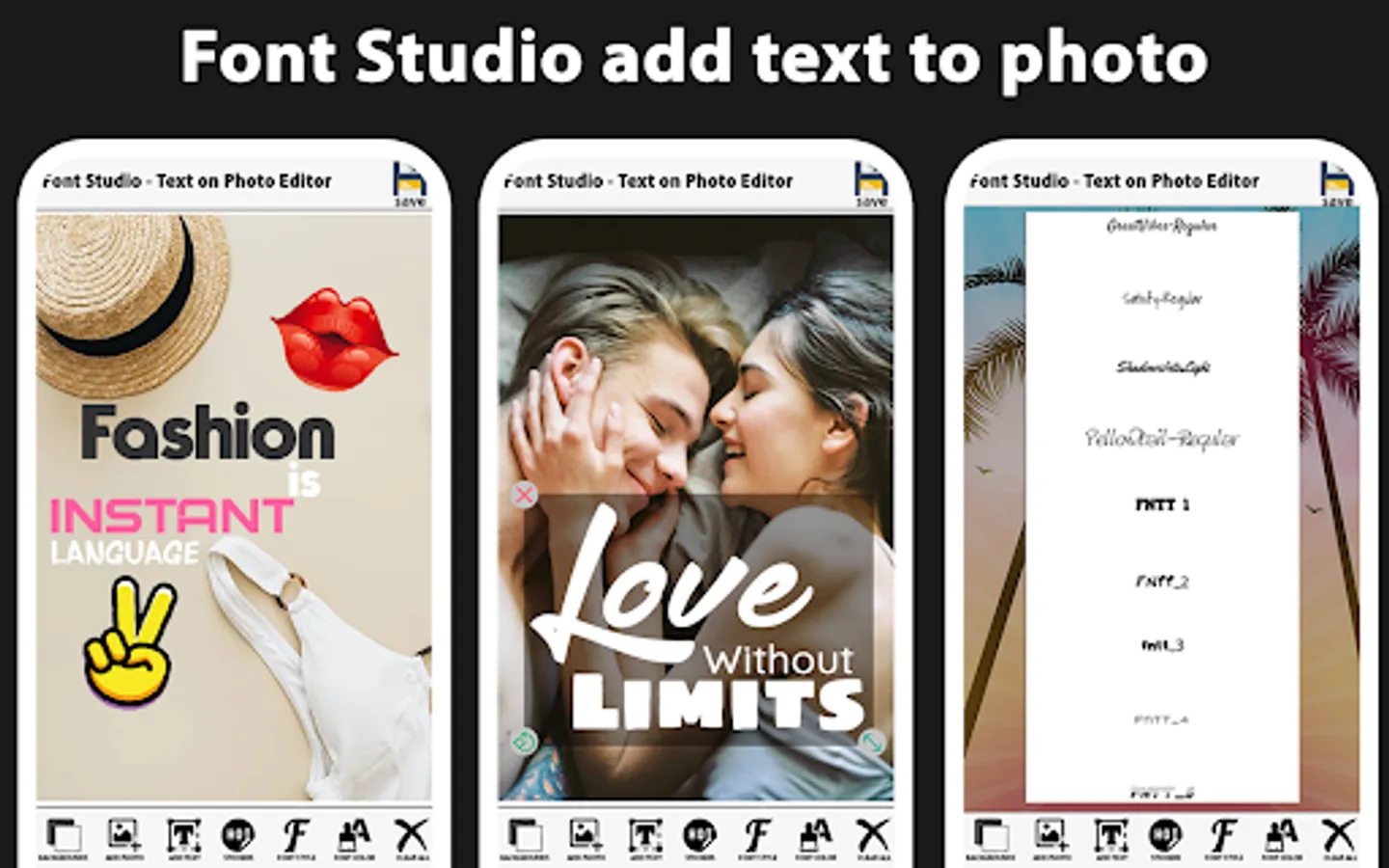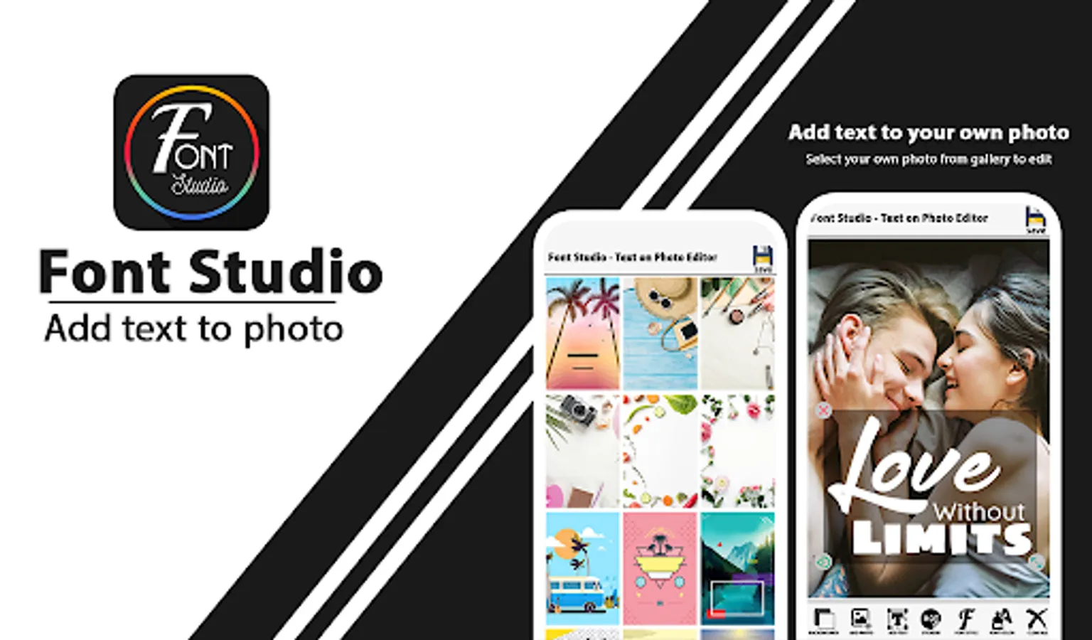 Font studio text on pictures, Text on Photo - Text to Photo , lets you easily add stylish text or typography design to your pictures. The very easy to use fancy text generator stuffed with font style, free fonts, font awesome, cool fonts, calligraphy fonts, cool text fonts. Add text to image with this easy image text editor just in few steps that makes you more easy on making picture to text then an online image text editor. You can use this app as a multipurpose tool like photo editor app, stylish text generator, invitation maker, text to image, text art or as an photoeditor by which you can easily edit text in image its a fully free photo editor or picture editor for any type of photo editing or letter writing or photo to text .