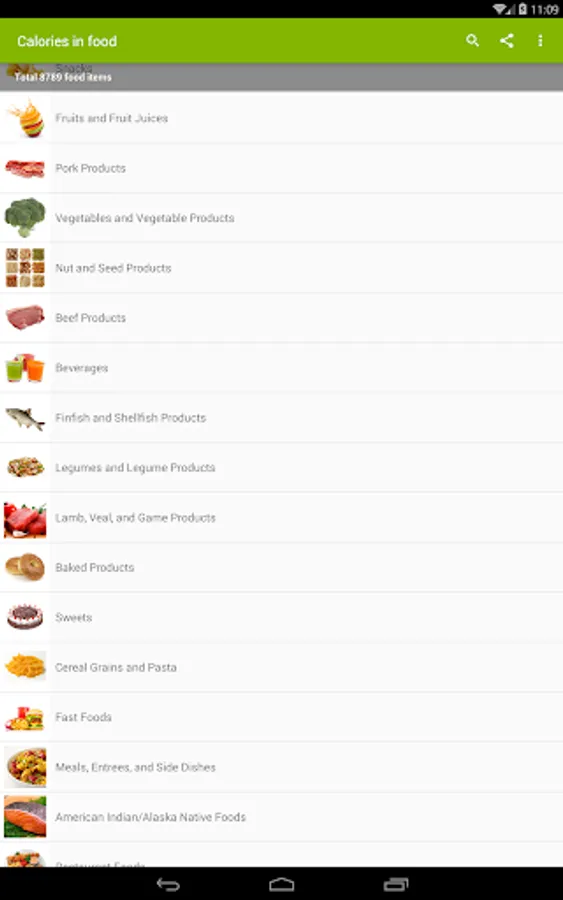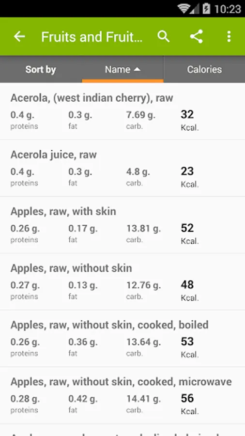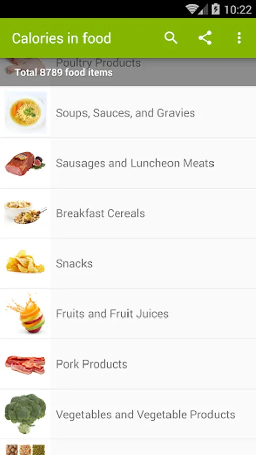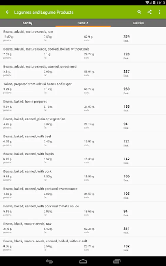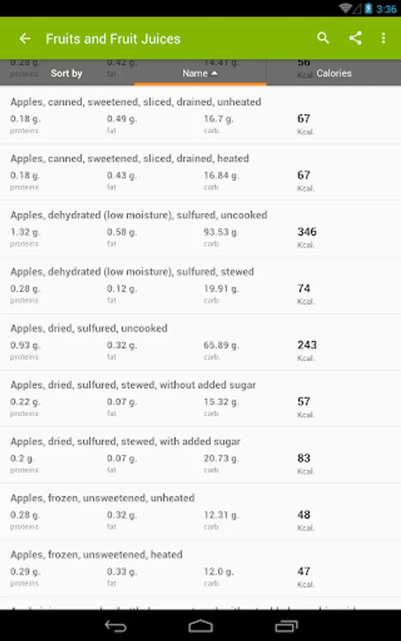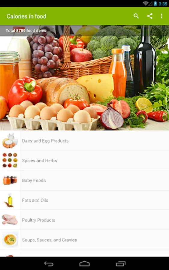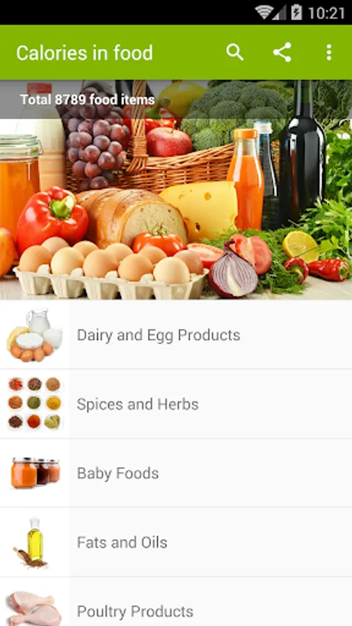Using the calories table you can define the energy value of the most popular food items and cooked foods. As well, you can learn and correct your daily eating. General list includes the information on energy, carbohydrates, proteins and fats content in 100 grams of food. Energy value is expressed in kilocalories (kcal). The app contains more than 8700 items, and for your convenience it is separated into sections, and food items are listed in alphabetic order. Data in table are maximally exact, but you shall remeber that cooking peculiarities of some food influence the energy value and content of proteins, fats and carbohydrates.