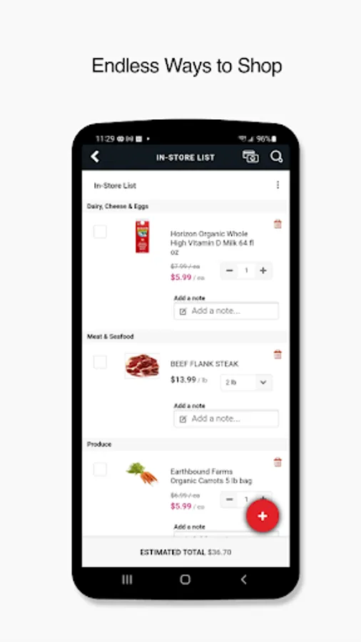 This feature groups future purchases together for shopping convenience! Add items from anywhere in the app. Easily check off items as you go throughout the store!
