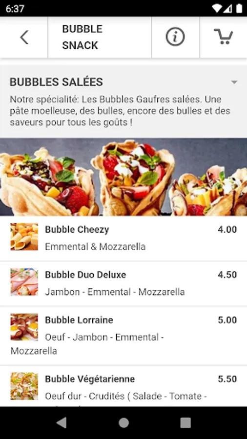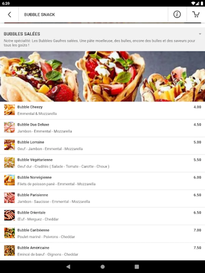 De délicieuses crêpes & gaufres aussi bien sucrées que salées, des Burgers maison, de délicieux Hot-Dogs, des Tacos, Paninis, Bokits ou Agoulous accompagnés d'une part de frites et d'une boisson rafraîchissante.