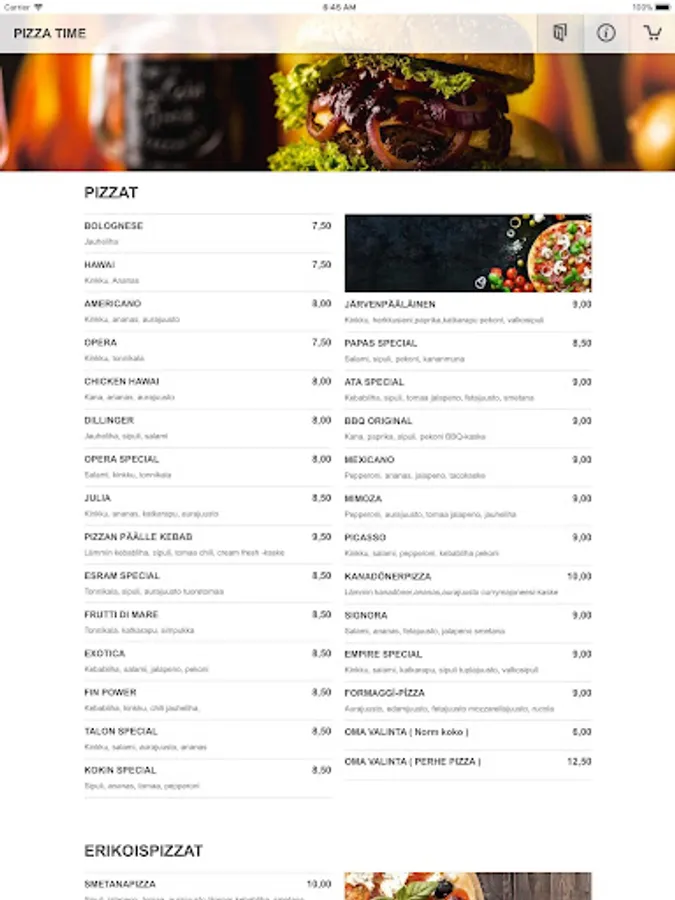 PIZZA TIME JÄRVENPÄÄ - sovellus. Tilaa syötävää helposti suvelluksemme kautta kotiinkuljetuksella. Tarjontaamme kuuluvat suosituimmat, pizzat, erikoispizzat, salaatit, burgerit, kebabit, kanakebabit, tortillat / wrapit ja juomat.