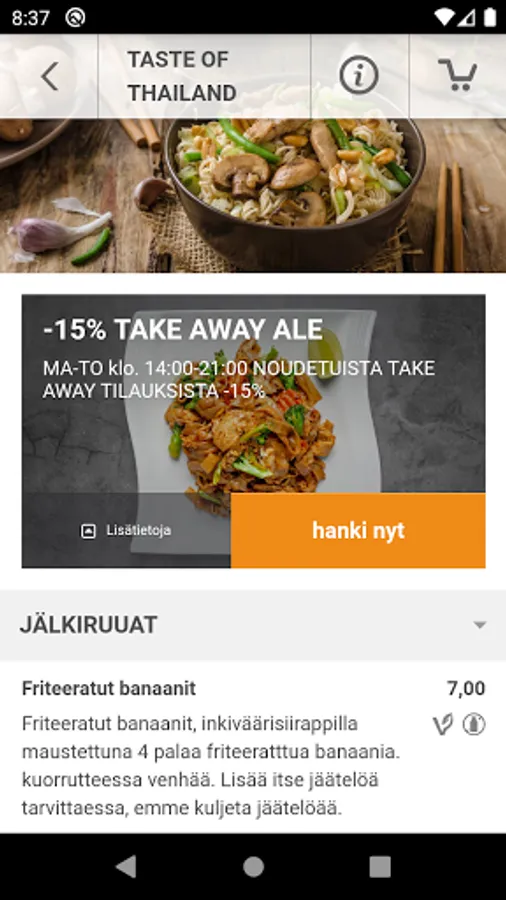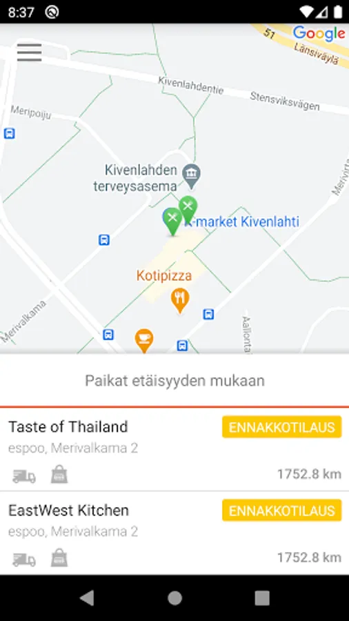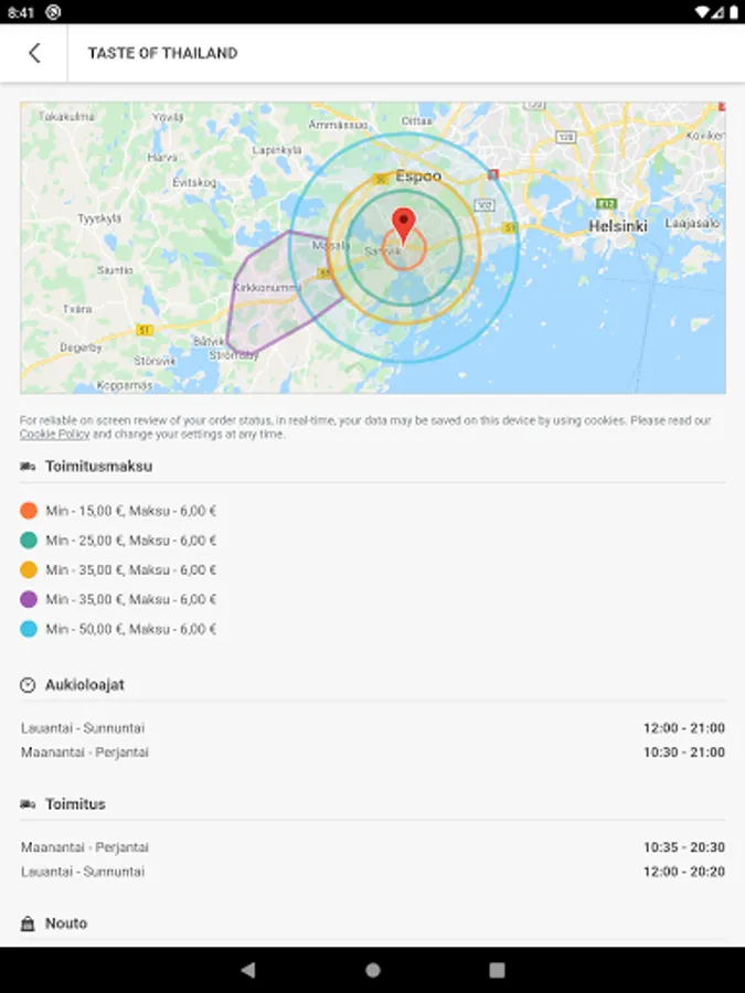 Haluatko tilata ruokaa verkosta ravintolastamme? Tämän sovelluksen avulla voit tehdä sen helposti. Nauti nopeimmasta tavasta tilata suosikkiruokasi. Ominaisuudet: - Online-ruokatilaukset optimoitu mobiililaitteellesi. - Maksutiedot ovat esitäytettyjä, joten voit tilata vain muutamalla napsautuksella. - Tallenna useita osoitteita ja valitse haluamasi osoite kassalla. - Tilauksen vahvistus reaaliajassa - tarkoittaen, että ravintolan henkilökunta vahvistaa tilauksen heti arvioidun valmiusajan mukaan. Ei kielimuuria asiakaspalvelussa, ei hämmentäviä puhelinpalvelu keskusteluita, ei välistä vetäjiä kuten foodora ja wolt. Näin pystymme tarjoamaan parhaan palvelun juuri sinulle