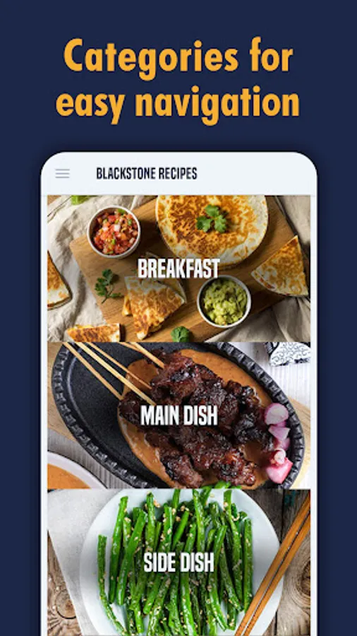 For easier browsing, recipes in our Blackstone Griddle app have been grouped into several categories such as main dish, side dish, breakfast, desserts, seafood recipes, vegetarian, meat recipes and a few others.