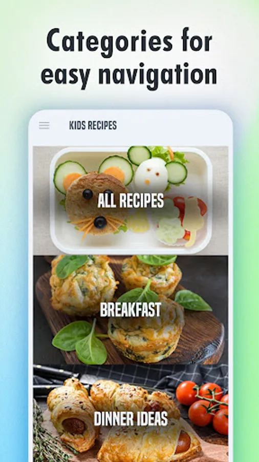 This kids recipes app will finally make preparing food as simple as possible for families with kids. There's no need to waste time thinking which food to prepare for your children. In this app you will find healthy breakfast and easy dinner recipes for family which are all kid friendly recipes. There are plenty of healthy snacks for kids included in our kid recipes app. Your kids will love these kids food recipes.