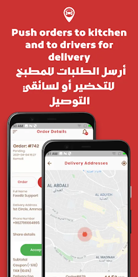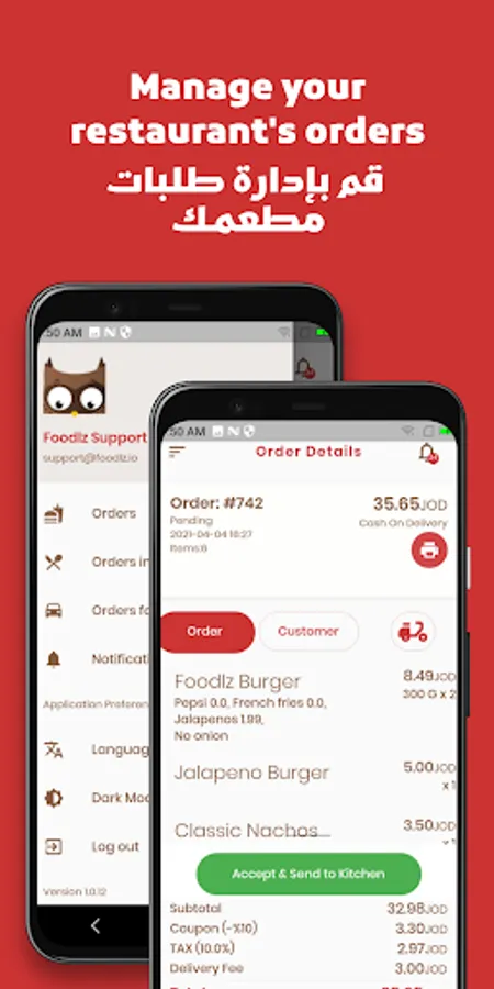 Get notification when new order arrived. Manage your restaurant's orders, push order to kitchen and to driver for delivery after preparation, or just mark it as complete for customer to pickup.