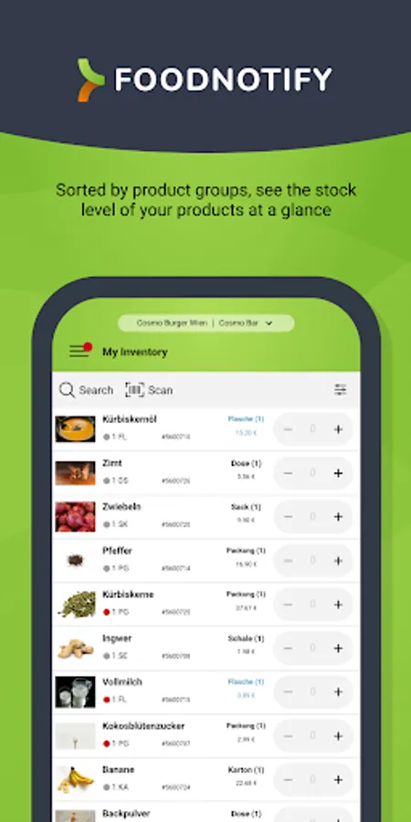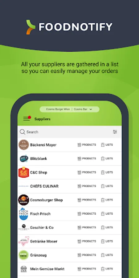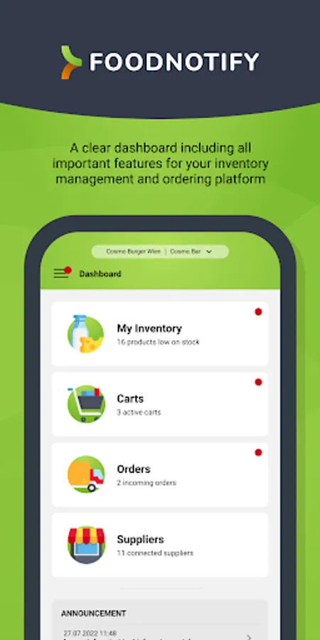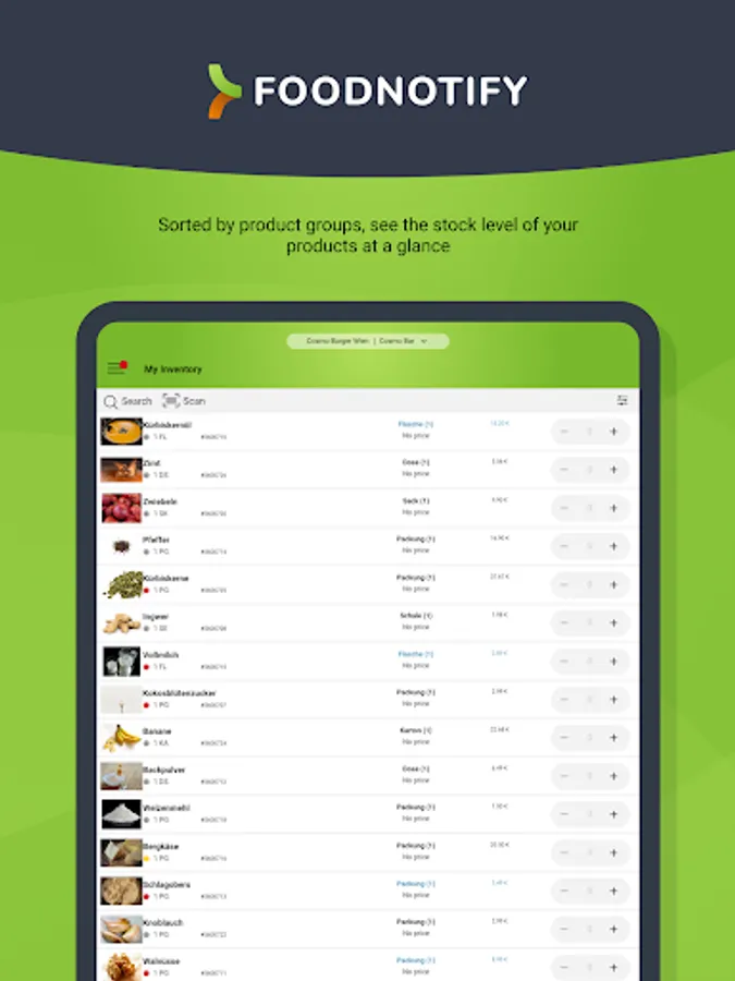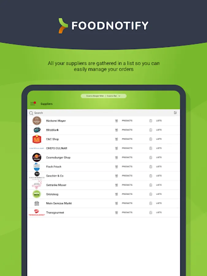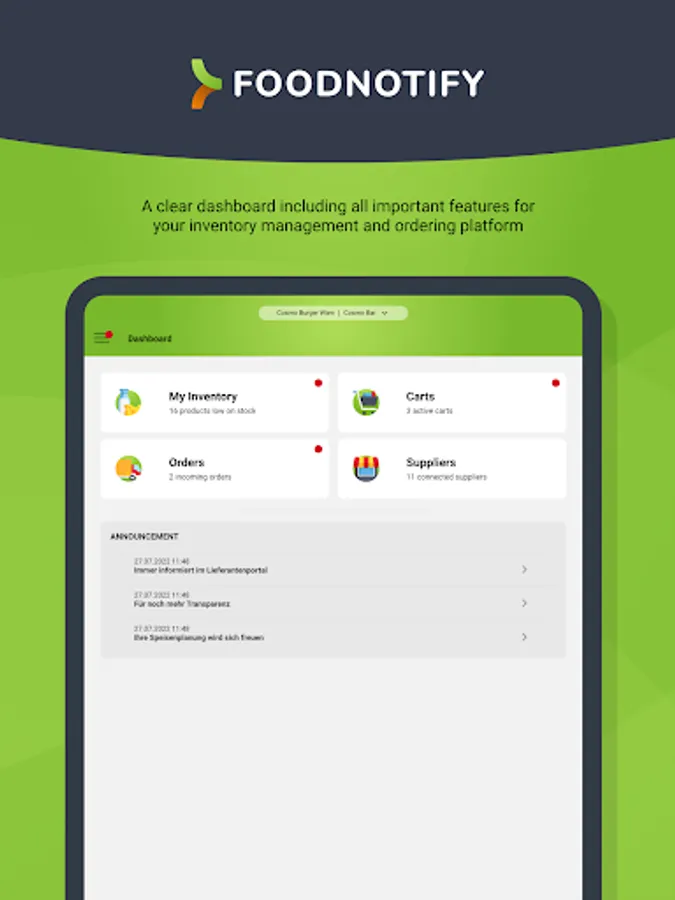 With the FoodNotify Mobile App you can easily place orders with your suppliers, accept the delivery of goods and check the current stock levels in your inventory management system. Optimize your goods-related processes in the restaurant, hotel or catering business at any time.