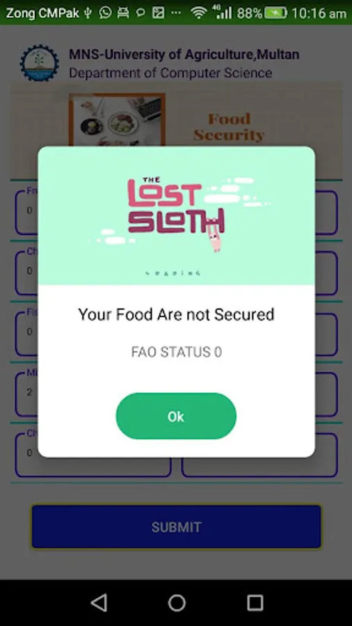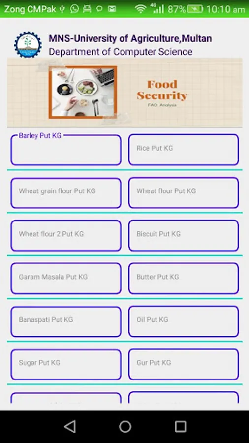 Hello users in this app you check your food status. They app calculate different parameters and at the end they are showing your status there food secured or not.