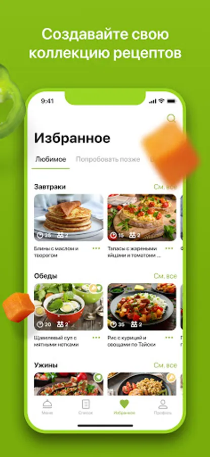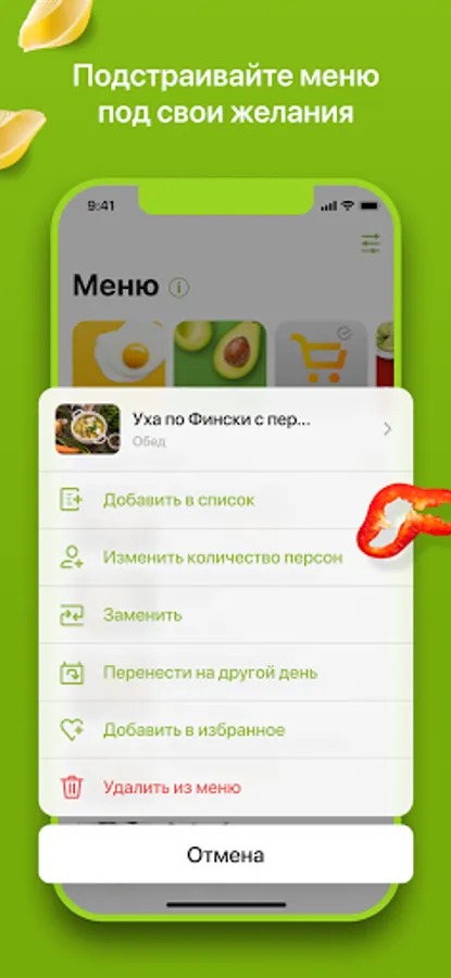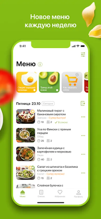 Every week you get a new menu - more than 50 recipes for cooking every day. Breakfast, lunch, dinner, salad and dessert are all you need for a complete meal for the day. Do you have special food preferences? We understand this. Therefore, in the application you will find classic simple recipes, as well as low-carb, vegetarian and keto menus. Proper nutrition (PP) is a new trend. And with us, taking care of your health will be even easier.