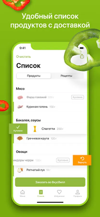 You can order delivery from VkusVill or Metro for the future according to the list of products in just 1 click. 2 hours and a set of products will be brought to you. Now you can cook delicious meals without leaving your home.