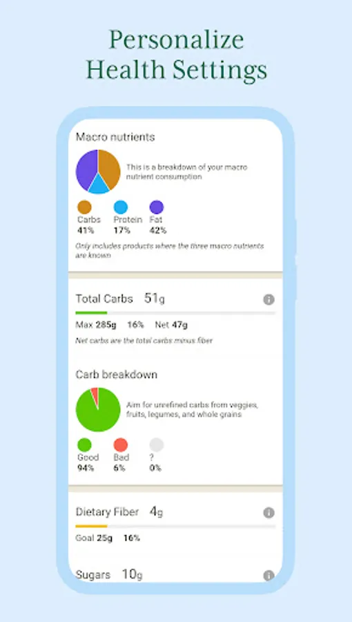 Explore Fooducate Pro’s advanced diet tools to make the most of your health journey. With Fooducate Pro, you can set and track your nutrient intake over time. As an added benefit, subscribers get personalized diet recommendations for: heart health, diabetes, kidney disease, bone health, and irritable bowel syndrome (IBS). Plus, you can easily export your data to share with a healthcare professional or save to your personal records.