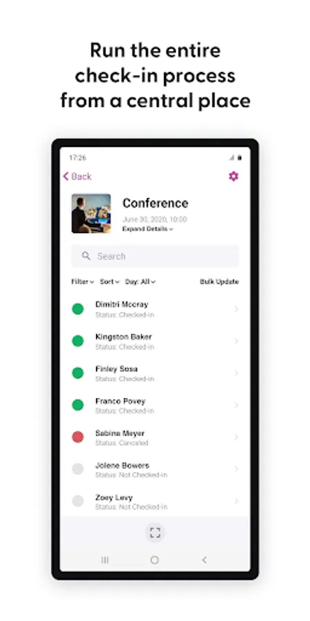 Quickly change the ticket status of multiple attendees by using the bulk update feature. Simply select the tickets and mark them as checked-in, checked-out or canceled.