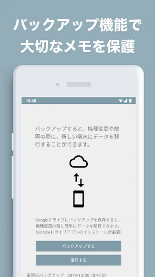 Data can be backed up to a file. Even if your device fails, you can easily restore your data. Also, if you change models, you can easily move the data to the new terminal and take over. You can select both SD card and Google Drive for the backup file creation destination. (Data can be transferred only between Android devices, data cannot be transferred between Android and iPhone)