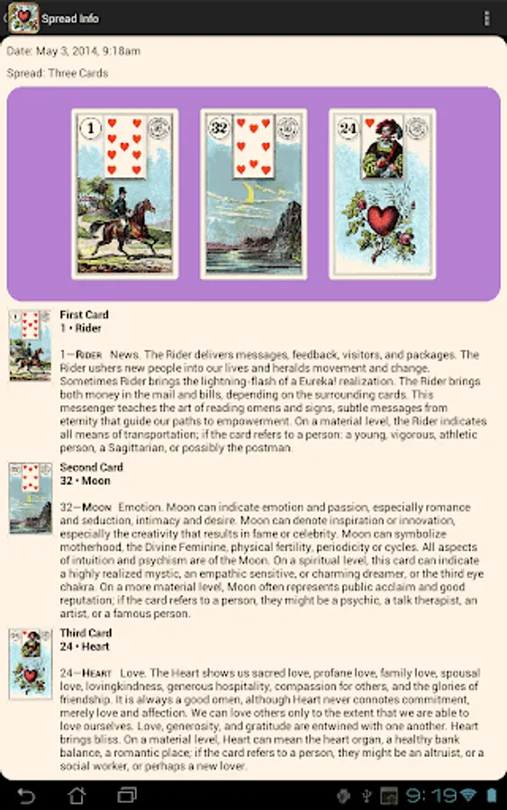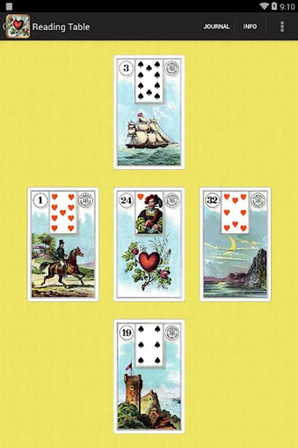 The images in Lenormand are simpler, more straightforward, and easier to interpret than Tarot. In Lenormand, cards take shades of meaning from the neighboring cards. A row of Lenormand cards can be read like a sentence. Learn card meanings while playing with the app!