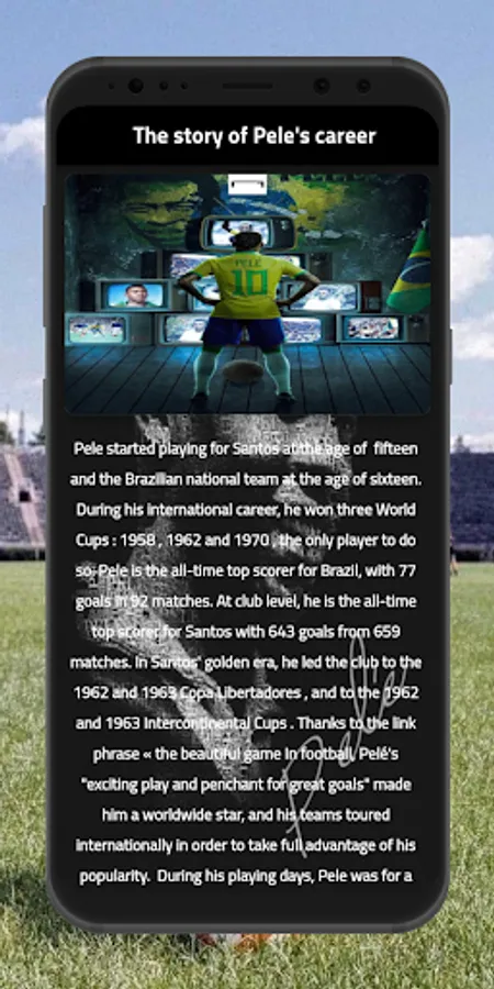 All of this and more you will find in the Pele wallpaper application, Pele that legend player in the world of football, winner of many awards and records, in the Pele wallpapers application where you will be able to download Pele wallpaper in high quality and Pele wallpapers in a small size, so do not forget to download the wallpapers application Pele, evaluated.