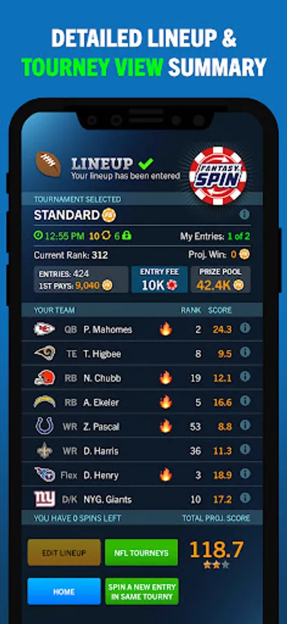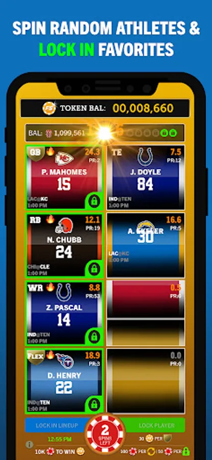 Four different multi-spin tournaments with up to 10 spins per line-up (Standard, 1v1 Duel, 50/50, & Winner Take All). Start with a random line-up and build your dream team by locking in your favorite players (up to 6 locks), or test your luck with a single spin by entering Quick Pick tournaments.