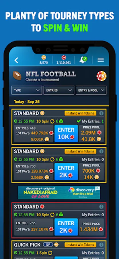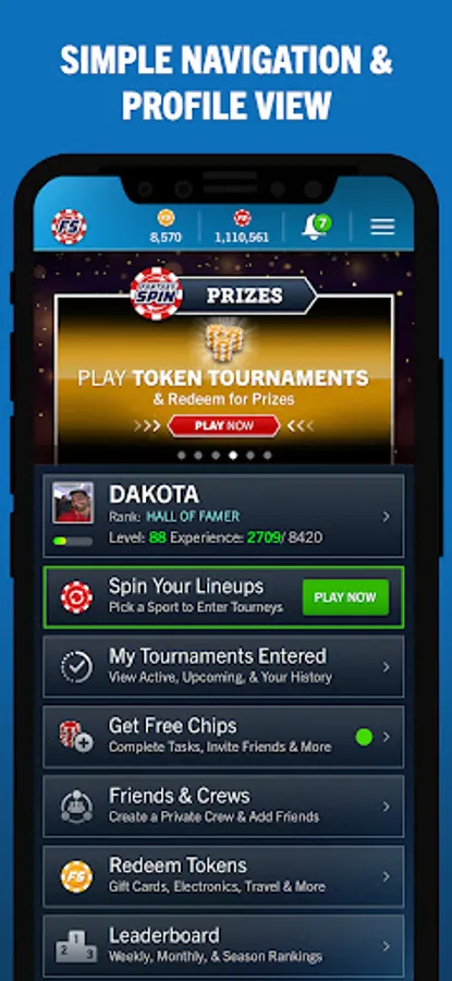 • Friends Tournaments: Invite your friends to a private FantasySpin crew and challenge them to daily and/or weekly tournaments.