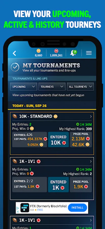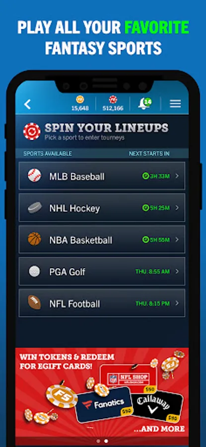 Compete against other users or your friends and track your team with live stat updates. Enter tournaments to win either Chips or Tokens. Play in Token Tournaments and redeem your winnings for real prizes!