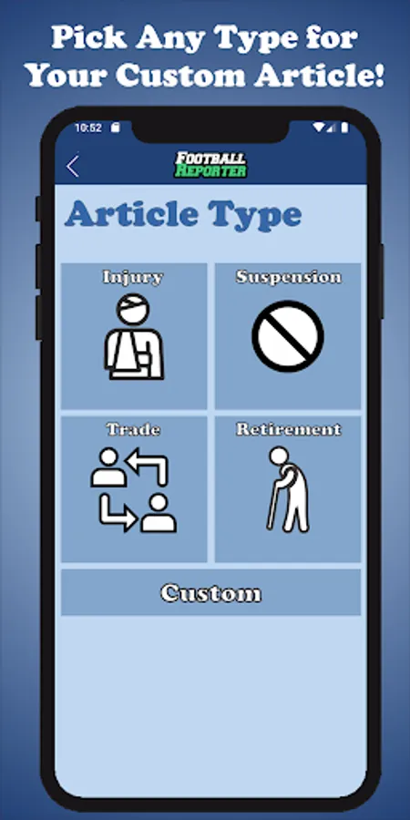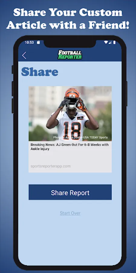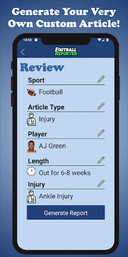 Football Reporter is the only app that allows you to generate and share your own custom breaking news football headline and article within seconds.