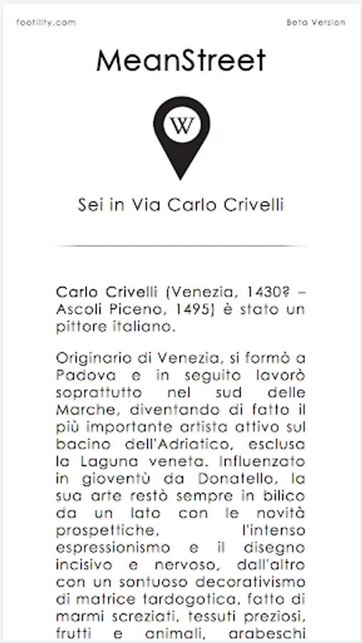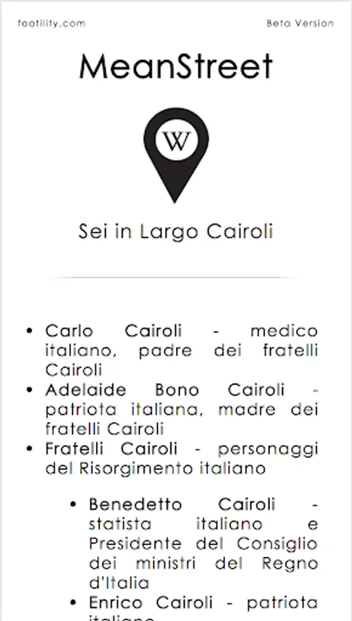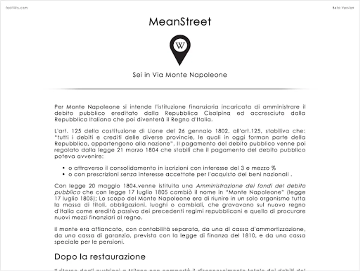 Often the streets of a city are dedicated names of artists, scientists and politicians and other important personalities or celebrities who have left a trace in the history of mankind. MeanStreet is an application that allows viewing with just one click, the information about the name of the street where you are through your device. Useful for when visiting a tourist city, or even if, in your city, you find yourself in a street with a particular name during a walk.