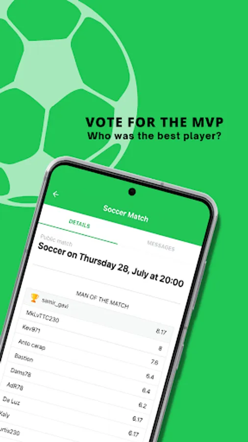 Invite your players and automatically count the answers (Present/Absent). Save time with the waiting list and the composition of the teams before the match. Invite the participants to elect the man of the match.