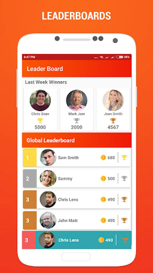 👉 LEADERBOARD: Leaderboard holds the overall participate rank and scores.It helps to know the top players and know your rank instantly.