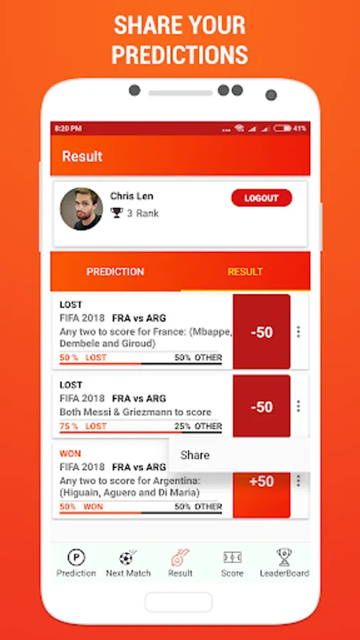 👉 SHARE : You can share your prediction to your friends. Let them know how better you are on sports predictions.🔗 🔗 🔗