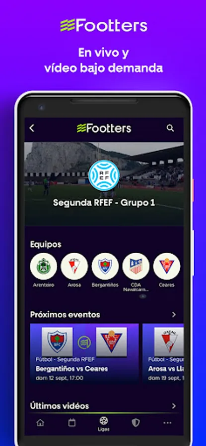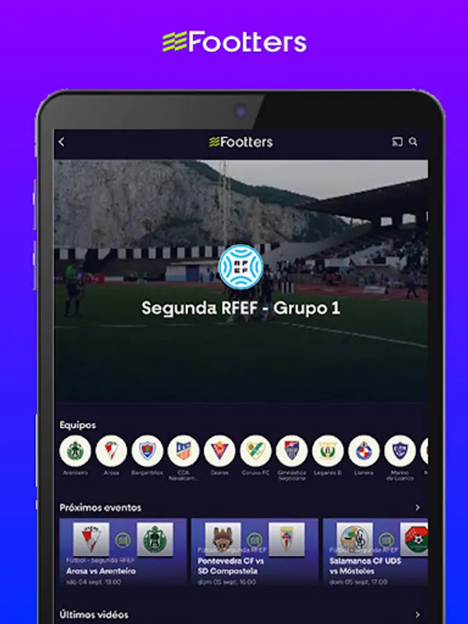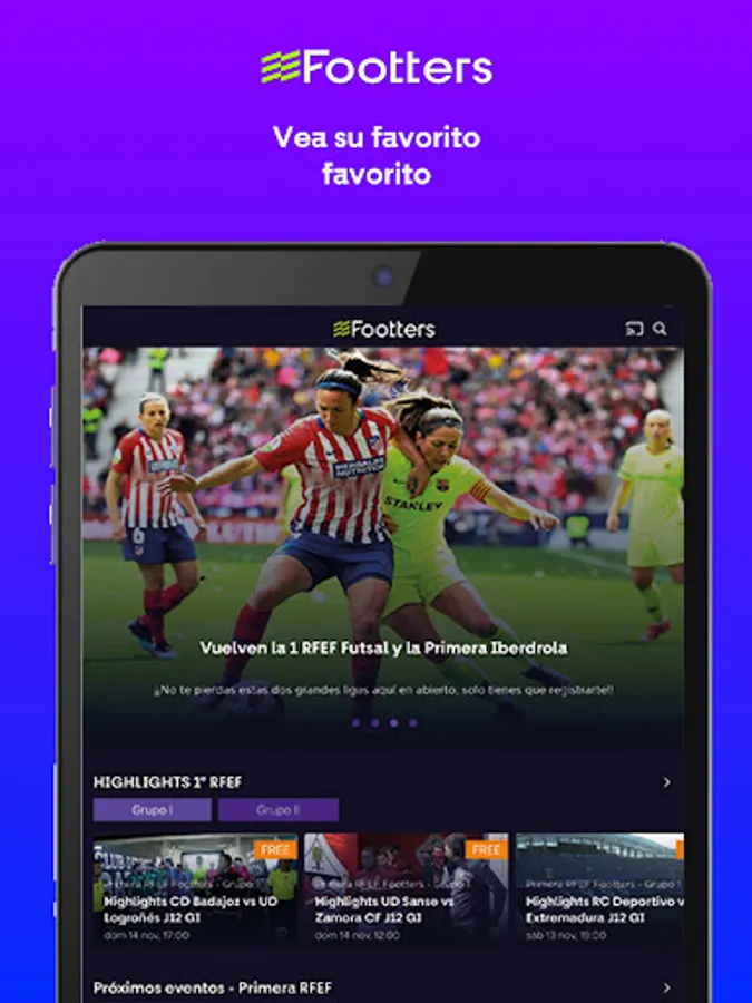 Footters is the streaming platform that gives visibility to authentic football, broadcasting up to 150 live matches in a weekend. On our platform you can enjoy live and delayed matches of Primera RFEF Footters, Segunda RFEF, some matches of Third RFEF, Futsal League, Women's football and Italian Serie B. Also, all the original Footters content that we produce exclusively for our platform, the rankings, results, players and much more.